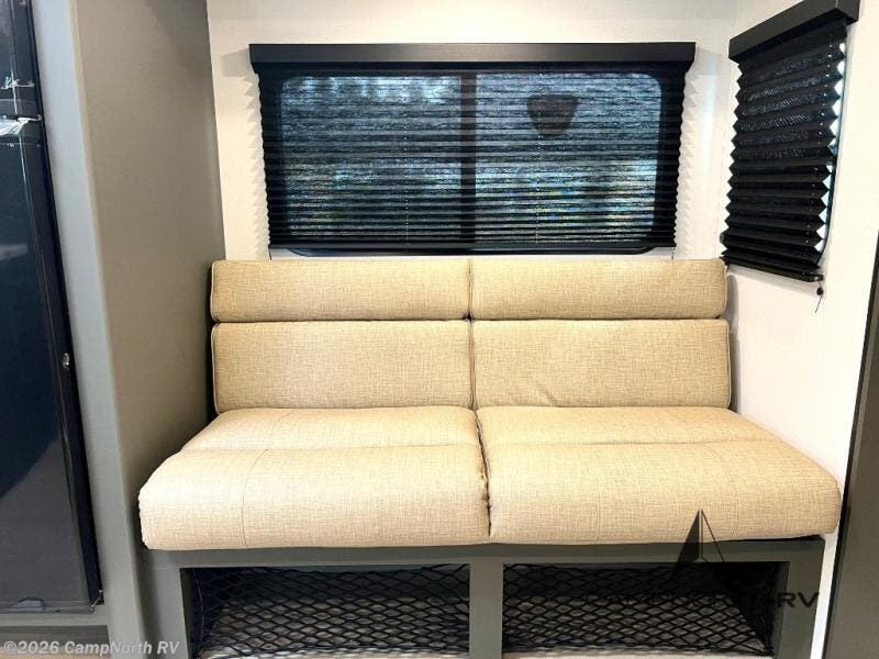 The rear kitchen provides expanded counter space and storage for meal prep, while the slide free layout keeps towing simple and predictable. Dual entry doors improve campsite access, and the walk through bath separates the living area from the private bedroom.