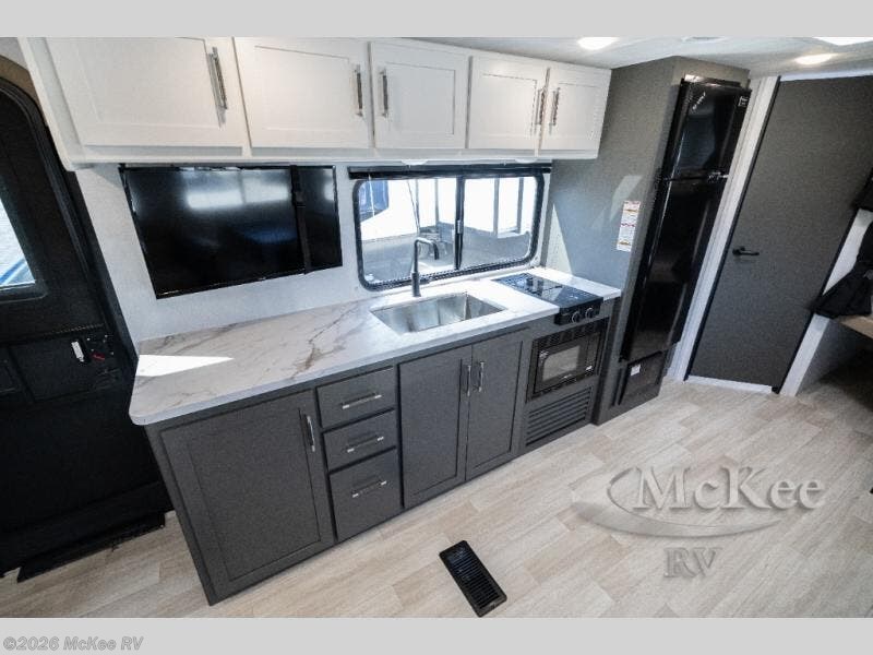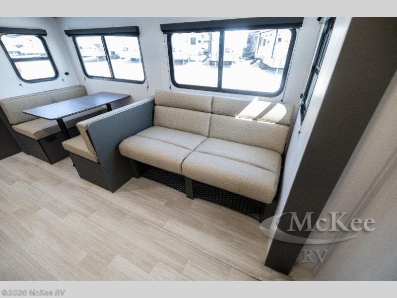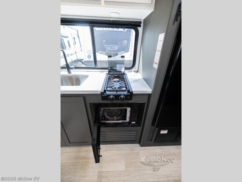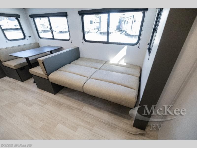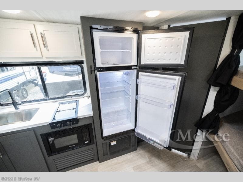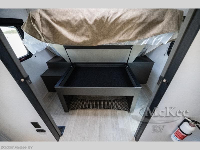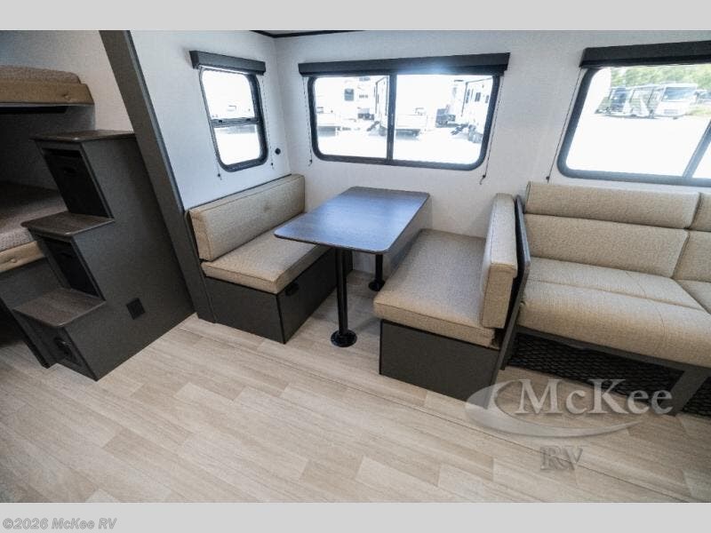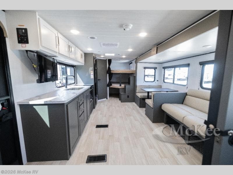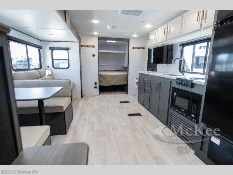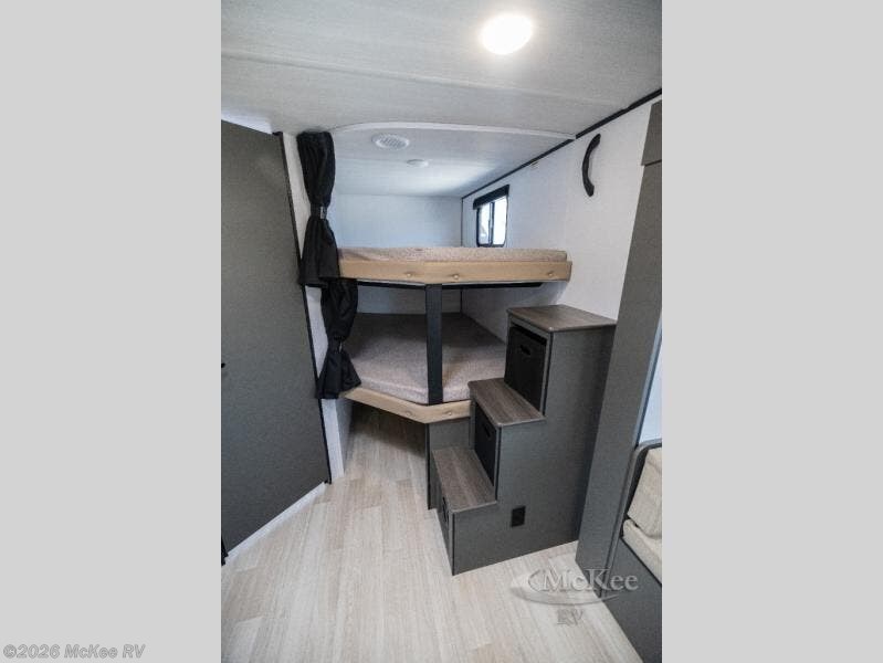You can't go wrong with this travel trailer in tow! The double-size bunks feature a flip-up bunk for added storage, and they are right next to the full bath for easy nighttime use. You'll find the front semi-private bedroom to be accommodating with its queen bed and dual wardrobes to keep your things tidy. Head to the combined kitchen and living room to relax on the jack knife sofa or play a game around the U-shaped dinette, and these areas can even double as additional sleeping space if needed! The full kitchen includes a cooktop and microwave to make meals, plus an 8 cu.ft. refrigerator and pantry for food storage. And don't overlook the exterior with its patio awning and pass-thru storage!