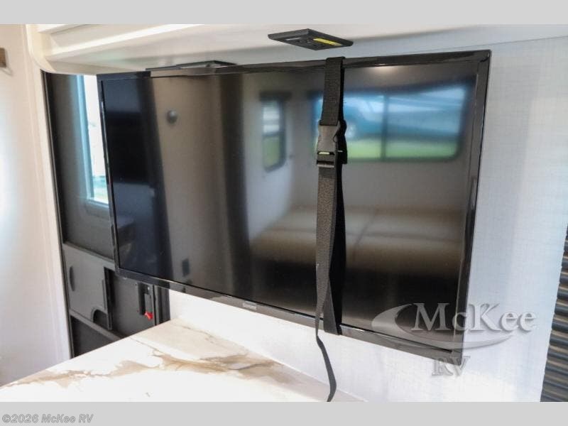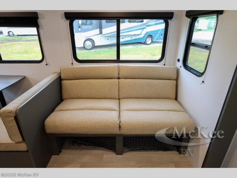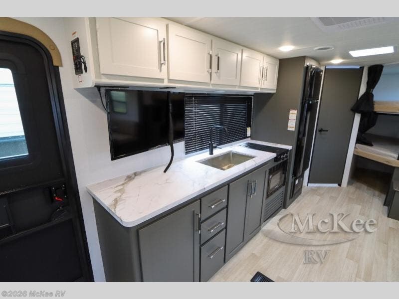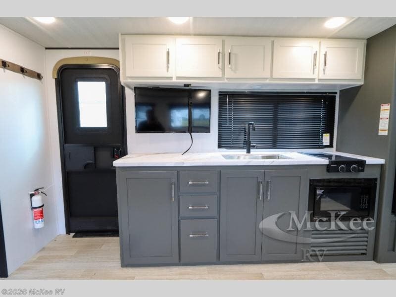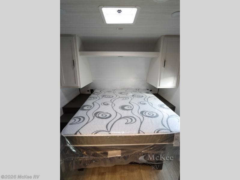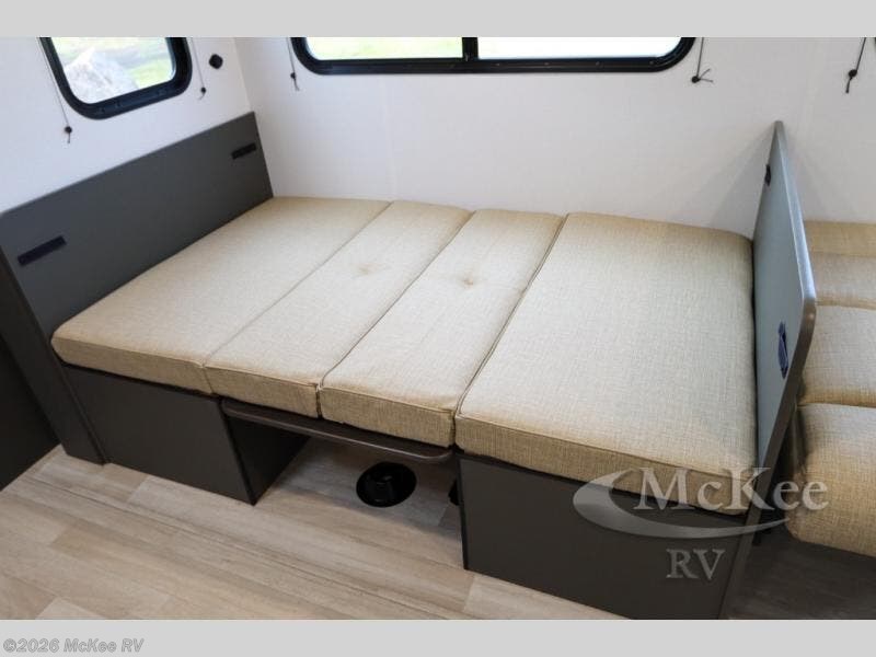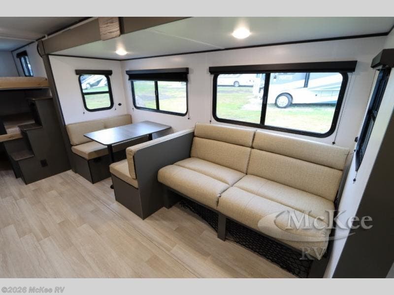 You can't go wrong with this travel trailer in tow! The double-size bunks feature a flip-up bunk for added storage, and they are right next to the full bath for easy nighttime use. You'll find the front semi-private bedroom to be accommodating with its queen bed and dual wardrobes to keep your things tidy. Head to the combined kitchen and living room to relax on the jack knife sofa or play a game around the U-shaped dinette, and these areas can even double as additional sleeping space if needed! The full kitchen includes a cooktop and microwave to make meals, plus an 8 cu.ft. refrigerator and pantry for food storage. And don't overlook the exterior with its patio awning and pass-thru storage!