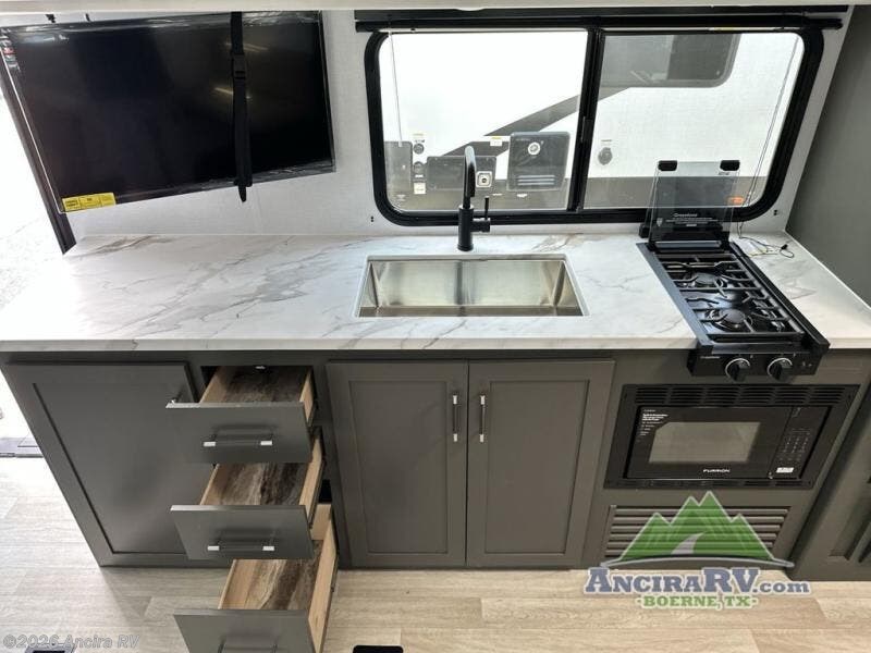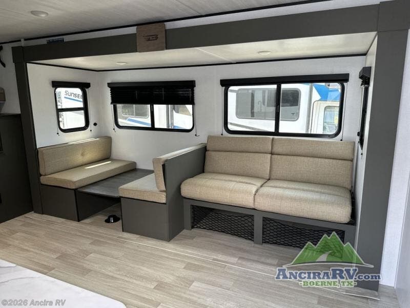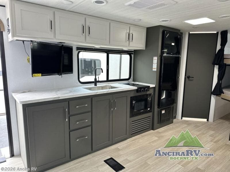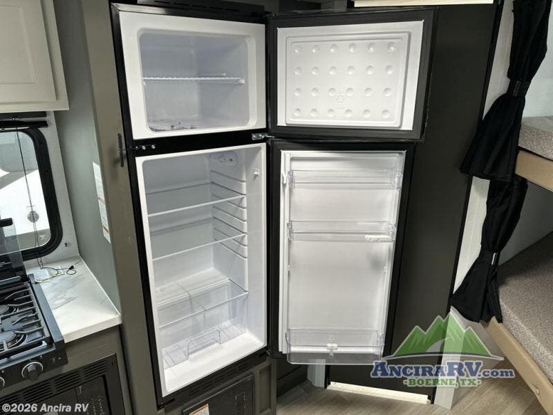 This travel trailer is designed for discerning families who crave adventure! The double-sized bunks provides a snug and inviting sleeping spot for kids, while the immaculately appointed full bathroom is thoughtfully designed for a refreshing stay. The kitchen is equipped with a generous pantry for storing gourmet ingredients, a high-performance refrigerator for keeping drinks and meals perfectly chilled, a rapid-cooking microwave, and a precision-crafted two-burner cooktop for preparing exquisite meals. Expansive overhead cabinets provide ample storage for fine china and cookware. The stylish booth dinette provides an intimate and convivial spot for meals and snacks, while the plush jackknife sofa offers a comfortable seating area that can be converted into a luxurious sleeping space. And after a long day in the woods, rest in the private front bedroom featuring a sumptuous queen-sized bed with a convenient nightstand and spacious dual wardrobes on each side.