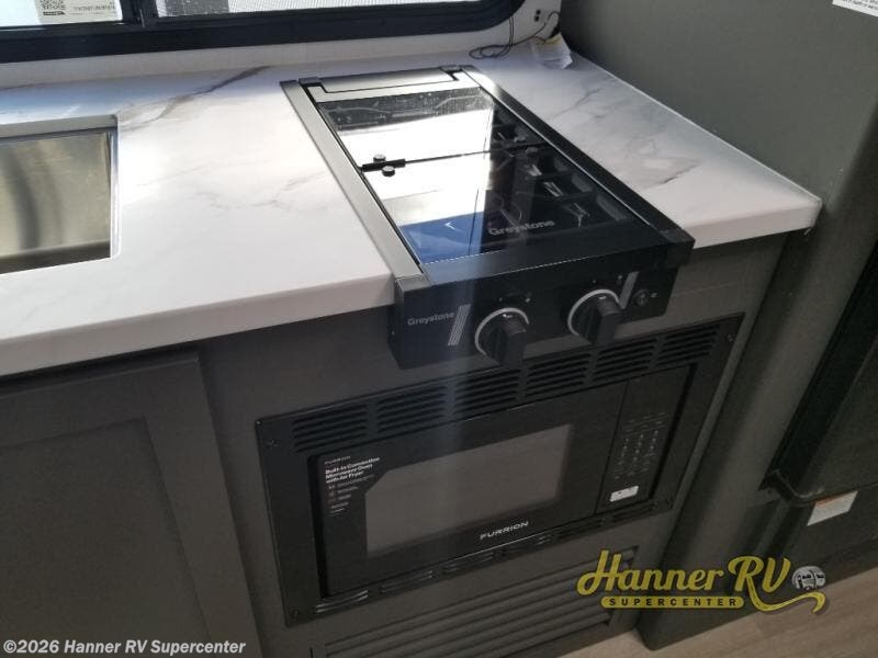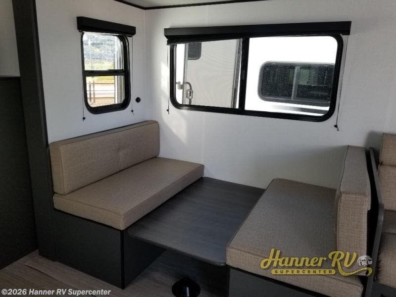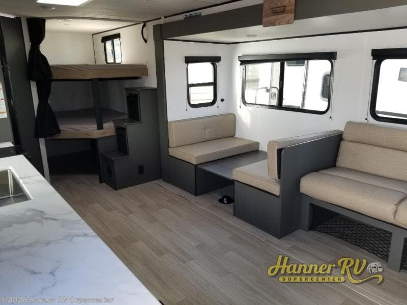 This travel trailer is designed for discerning families who crave adventure! The double-sized bunks provides a snug and inviting sleeping spot for kids, while the immaculately appointed full bathroom is thoughtfully designed for a refreshing stay. The kitchen is equipped with a generous pantry for storing gourmet ingredients, a high-performance refrigerator for keeping drinks and meals perfectly chilled, a rapid-cooking microwave, and a precision-crafted two-burner cooktop for preparing exquisite meals. Expansive overhead cabinets provide ample storage for fine china and cookware. The stylish booth dinette provides an intimate and convivial spot for meals and snacks, while the plush jackknife sofa offers a comfortable seating area that can be converted into a luxurious sleeping space. And after a long day in the woods, rest in the private front bedroom featuring a sumptuous queen-sized bed with a convenient nightstand and spacious dual wardrobes on each side.