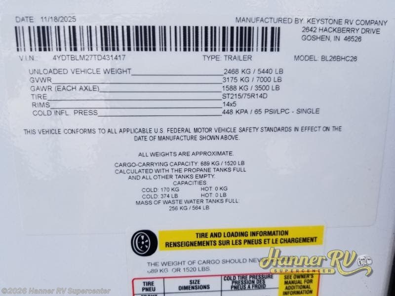 Request More Info on this 2026 Keystone Bullet Classic 26BHC Offered for sale by Hanner RV Supercenter