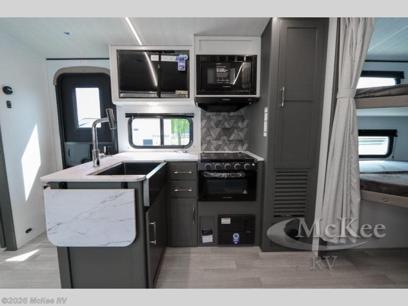 You can easily sleep eight in this travel trailer thanks to the 51" x 74" double-size bunks, the U-shaped Do-More dinette table, and the queen bed in the front bedroom. There is a laundry chute in the bedroom that will go straight to the pass-through storage for convenience. Whip up your best meals on the three burner cooktop, or use the microwave oven. You can dine around the dinette, or take your plate outdoors to sit under the 15' awning, plus there is an outdoor kitchen with a pull-out griddle and refrigerator.