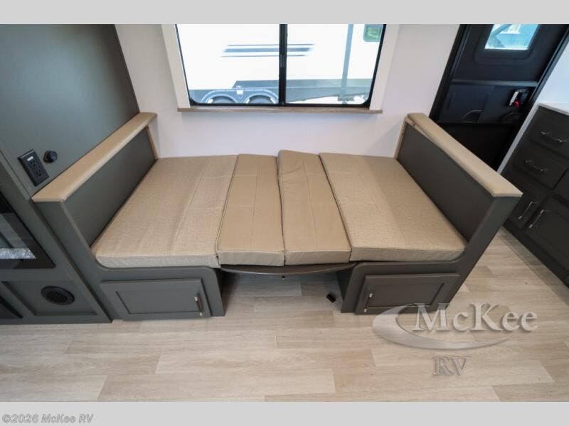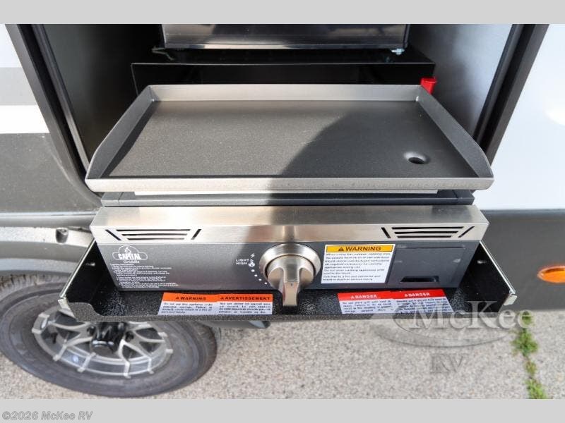 One step inside this dual entry travel trailer and you'll be sold! The rear kitchen features ample counter space to prep meals, and the booth dinette provides a place to dine together. There is also an outdoor kitchen with a griddle and mini fridge plus a 19' awning if you want to cook and eat outdoors. Two pantries and a 12V refrigerator will let you keep food stocked, and the tri-fold sofa slide provides sleeping space for guests. A walk-thru bath will create a front master bedroom you are sure to love, complete with a queen bed plus dual nightstands and dual wardrobes to keep everything tidy!