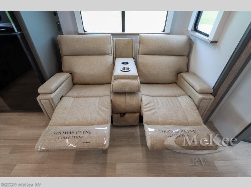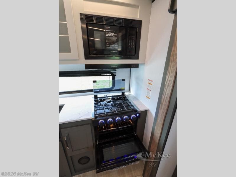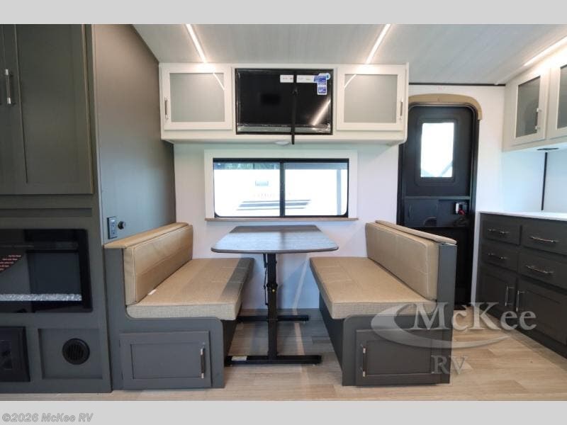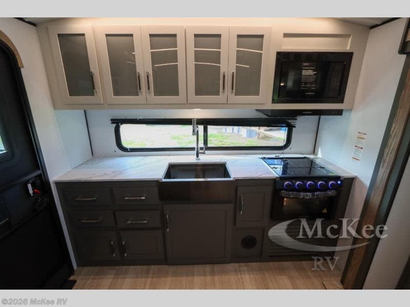 One step inside this dual entry travel trailer and you'll be sold! The rear kitchen features ample counter space to prep meals, and the booth dinette provides a place to dine together. There is also an outdoor kitchen with a griddle and mini fridge plus a 19' awning if you want to cook and eat outdoors. Two pantries and a 12V refrigerator will let you keep food stocked, and the tri-fold sofa slide provides sleeping space for guests. A walk-thru bath will create a front master bedroom you are sure to love, complete with a queen bed plus dual nightstands and dual wardrobes to keep everything tidy!