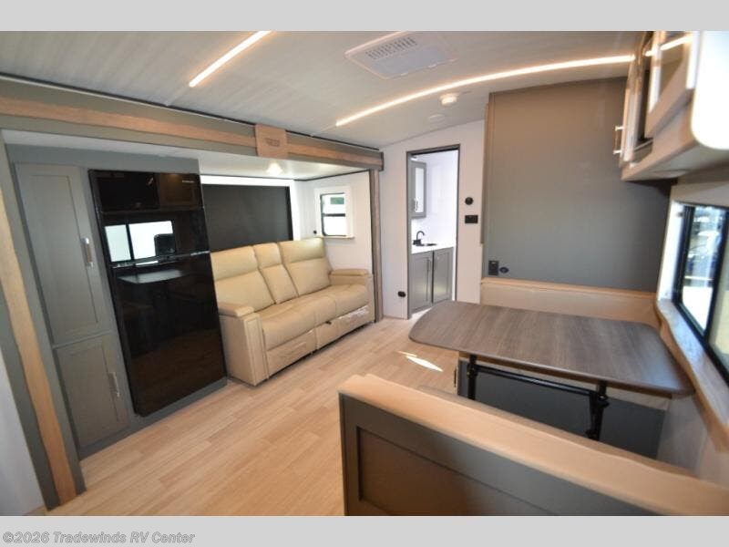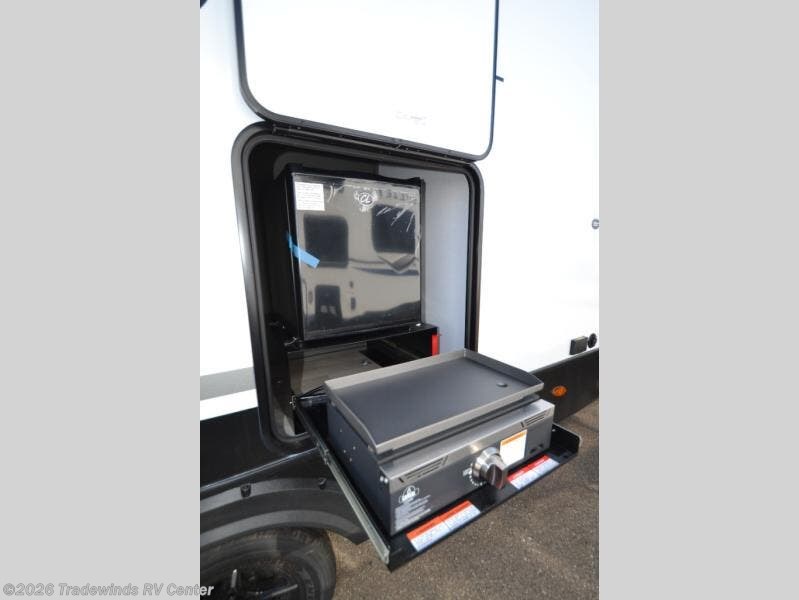 One step inside this dual entry travel trailer and you'll be sold! The rear kitchen features ample counter space to prep meals, and the do-more dinette table provides a place to dine together. There is also an outdoor kitchen with a griddle and mini fridge plus a 19' awning if you want to cook and eat outdoors. Two pantries and a 12V refrigerator will let you keep food stocked, and the tri-fold sofa slide provides sleeping space for guests. A walk-thru bath will create a front master bedroom you are sure to love, complete with a queen bed plus dual nightstands and dual wardrobes to keep everything tidy!