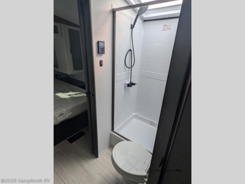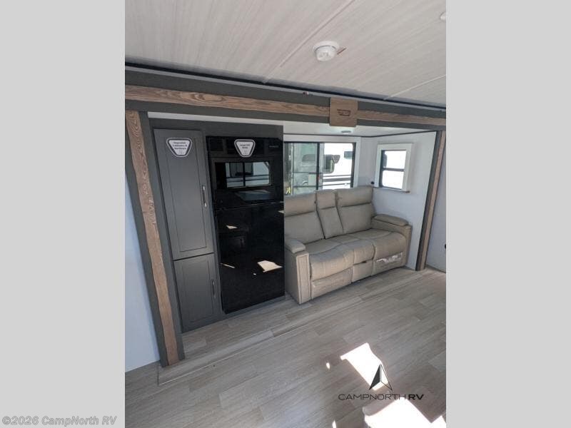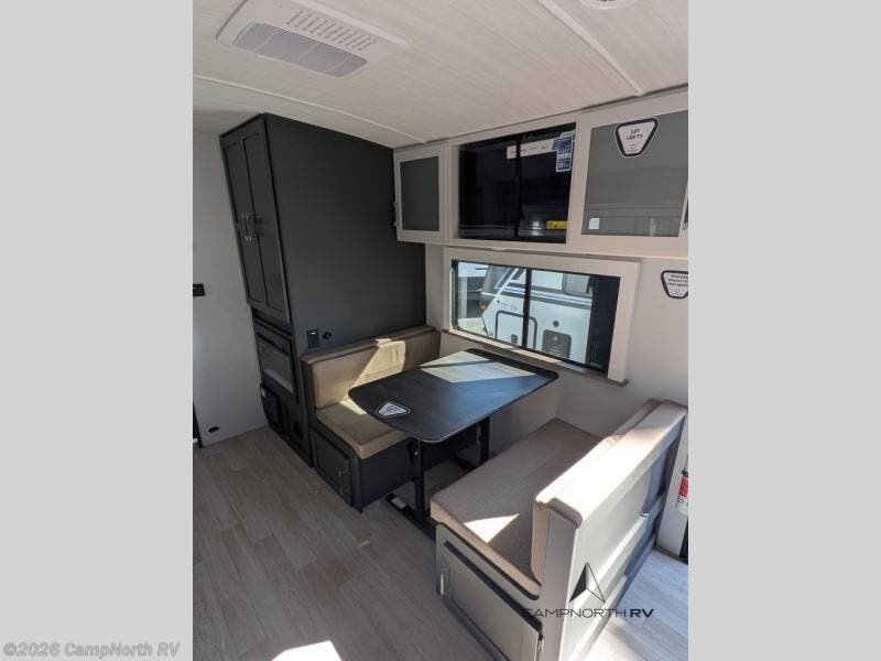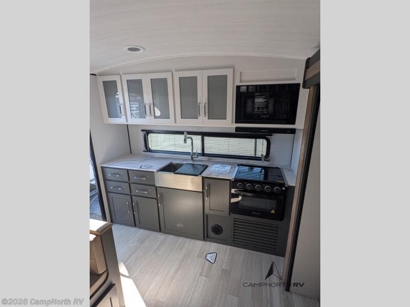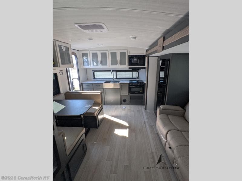 The rear kitchen gives you expanded prep space rarely found in this size class, while the slide out living area creates a comfortable interior lounge setup. The walk thru bath separates the living space from the private front bedroom for added privacy.