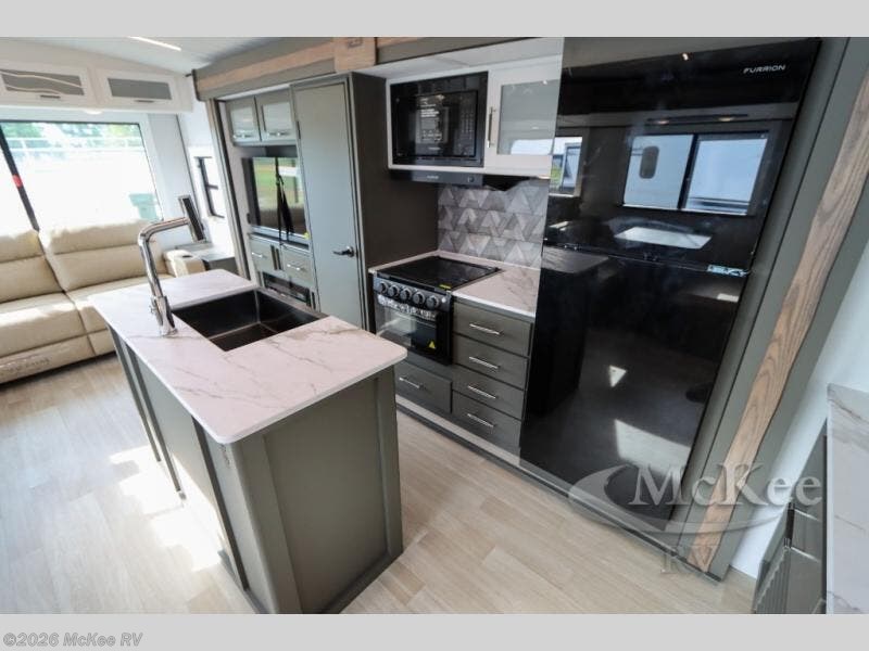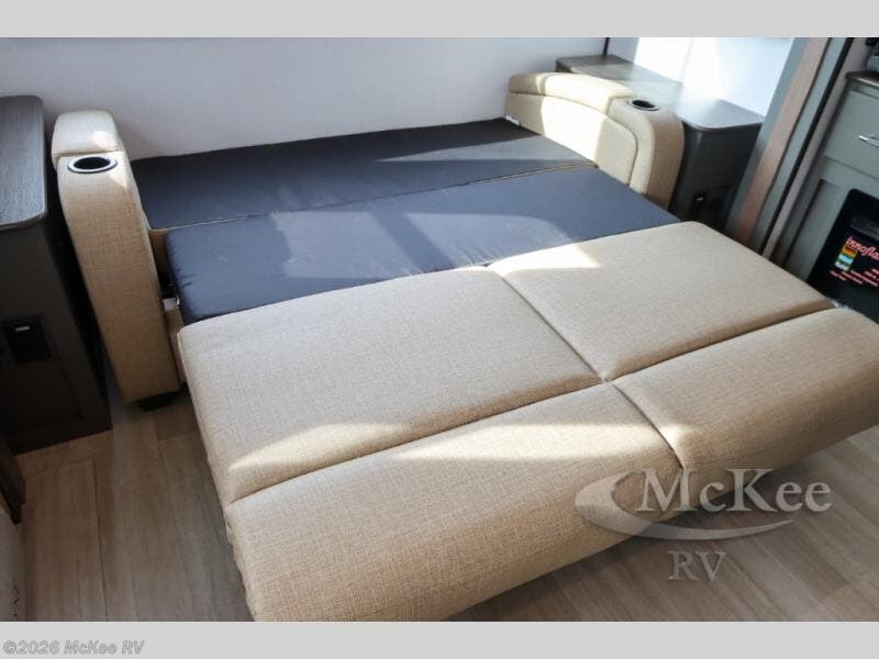 Weekend trips to the campground are made easy in this travel trailer! There are dual opposing slides in the combined kitchen and living area to provide you with ample space to stretch out. A kitchen island will come in handy when prepping meals, plus you'll have all the appliances needed to cook them. You will find comfortable seating on the rear tri-fold sofa sleeper, Do-More dinette table, and theater seats across from the entertainment center and fireplace. When you're ready to call it a night, the front private bedroom with a queen bed will be calling your name, and the full bath onboard will let you freshen up each day!