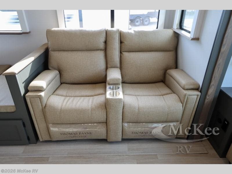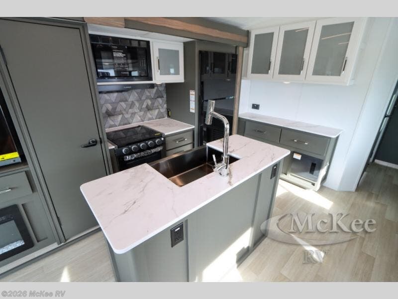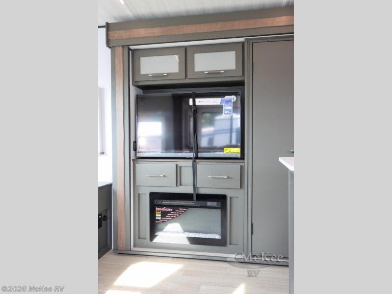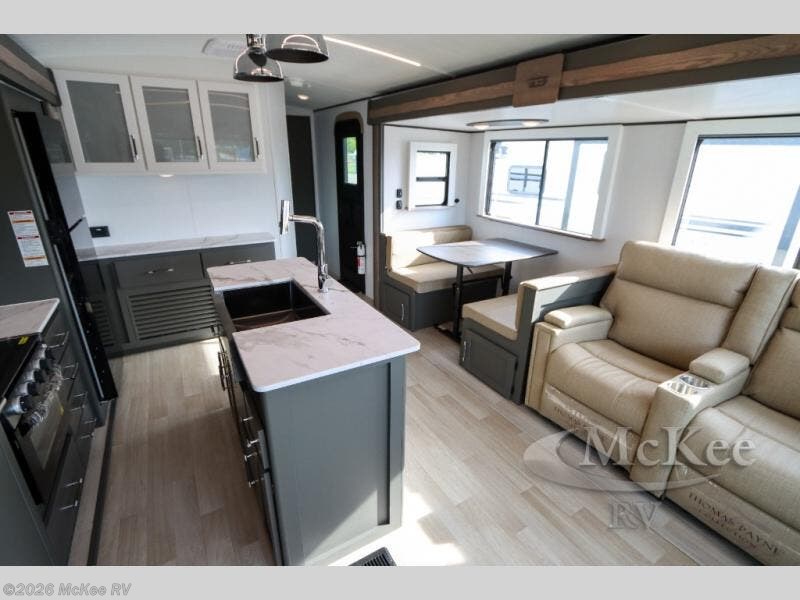 Weekend trips to the campground are made easy in this travel trailer! There are dual opposing slides in the combined kitchen and living area to provide you with ample space to stretch out. A kitchen island will come in handy when prepping meals, plus you'll have all the appliances needed to cook them. You will find comfortable seating on the rear tri-fold sofa sleeper, Do-More dinette table, and theater seats across from the entertainment center and fireplace. When you're ready to call it a night, the front private bedroom with a queen bed will be calling your name, and the full bath onboard will let you freshen up each day!