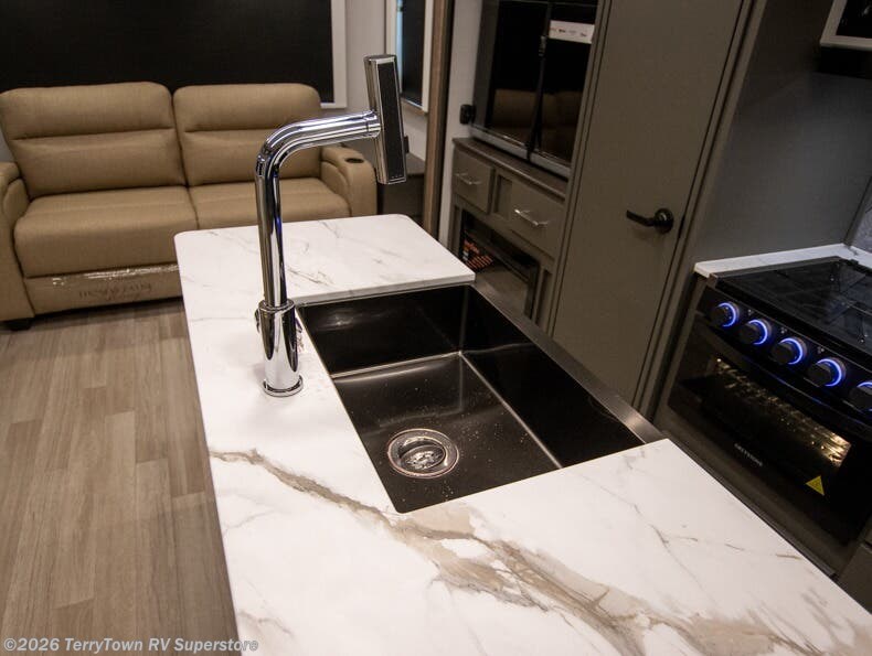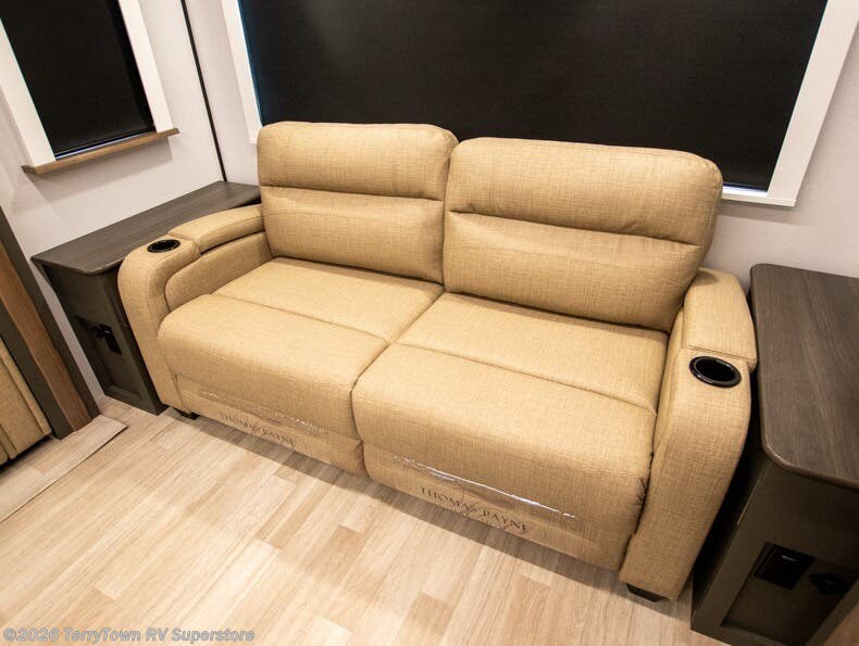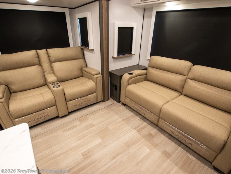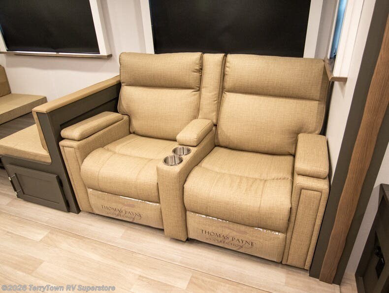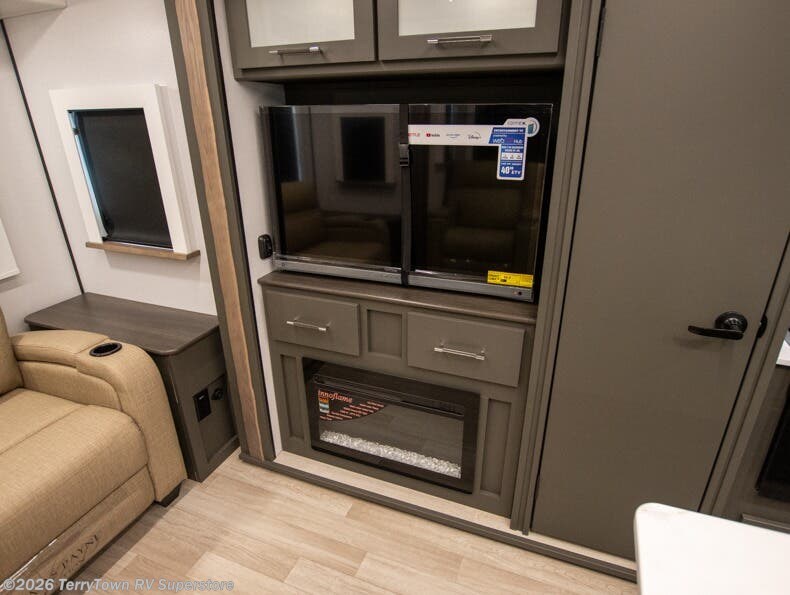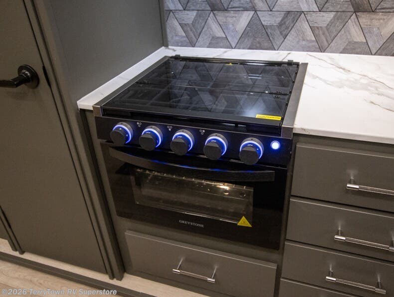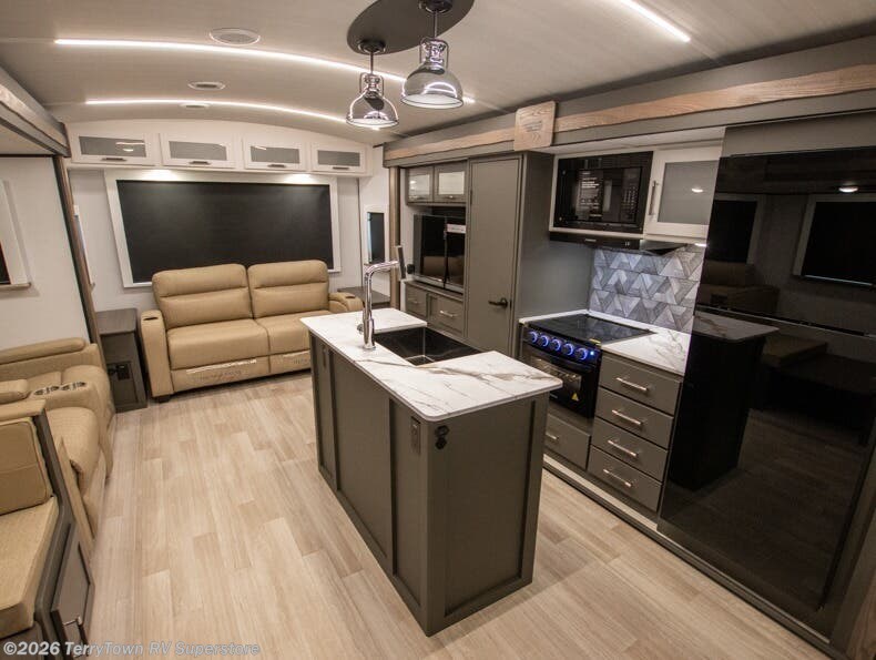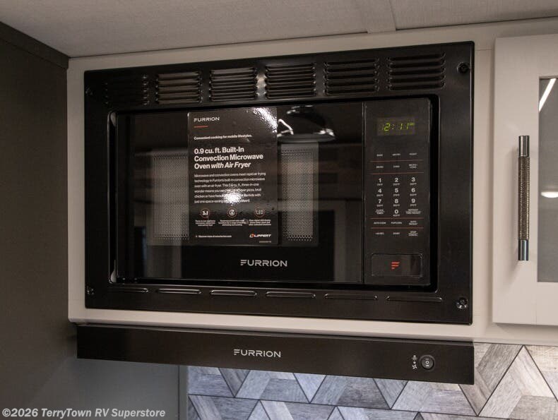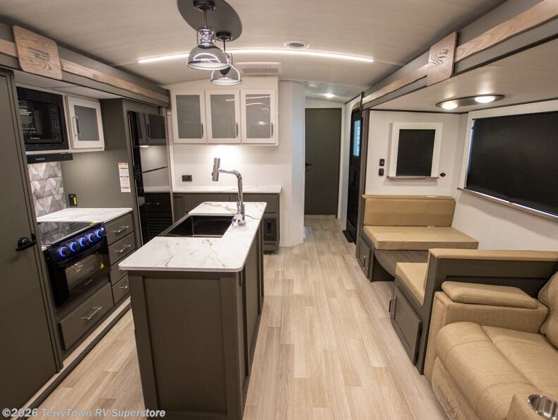 Weekend trips to the campground are made easy in this travel trailer! There are dual opposing slides in the combined kitchen and living area to provide you with ample space to stretch out. A kitchen island will come in handy when prepping meals, plus you'll have all the appliances needed to cook them. You will find comfortable seating on the rear tri-fold sofa sleeper, Do-More dinette table, and theater seats across from the entertainment center and fireplace. When you're ready to call it a night, the front private bedroom with a queen bed will be calling your name, and the full bath onboard will let you freshen up each day!