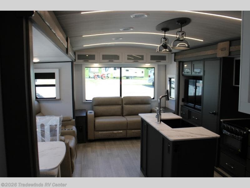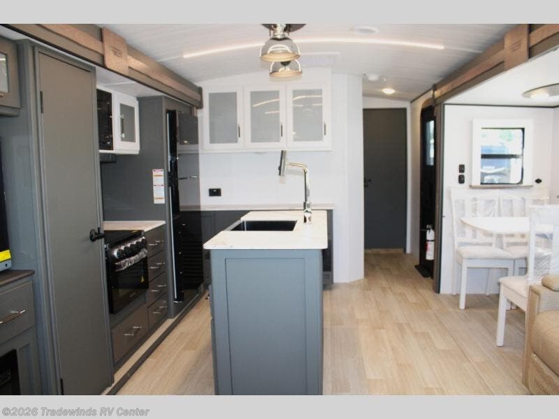 Weekend trips to the campground are made easy in this travel trailer! There are dual opposing slides in the combined kitchen and living area to provide you with ample space to stretch out. A kitchen island will come in handy when prepping meals, plus you'll have all the appliances needed to cook them. You will find comfortable seating on the rear tri-fold sofa sleeper, Do-More dinette table, and theater seats across from the entertainment center and fireplace. When you're ready to call it a night, the front private bedroom with a queen bed will be calling your name, and the full bath onboard will let you freshen up each day!