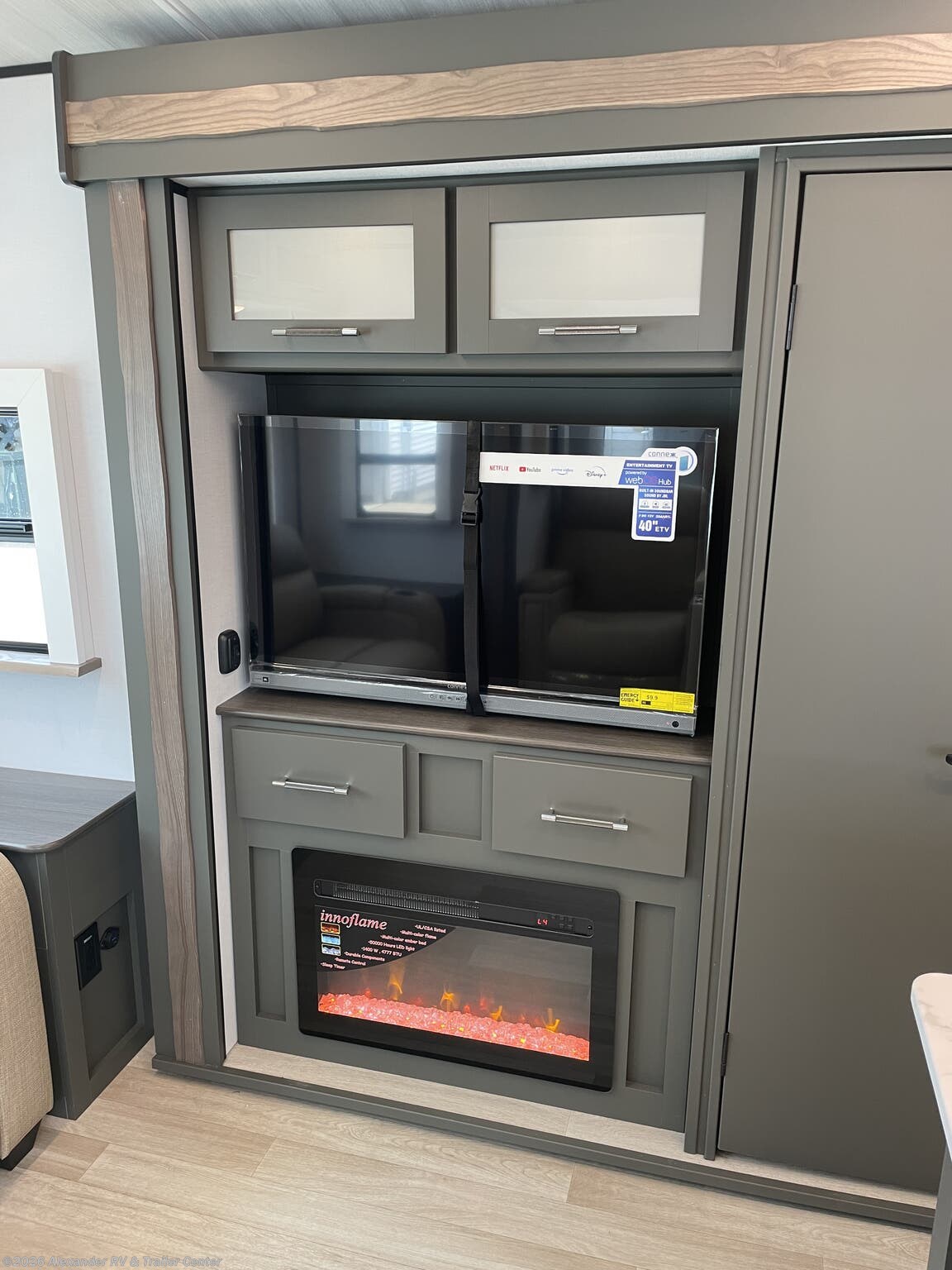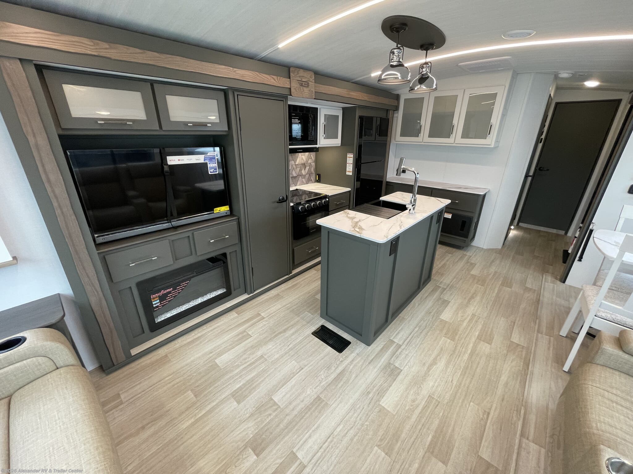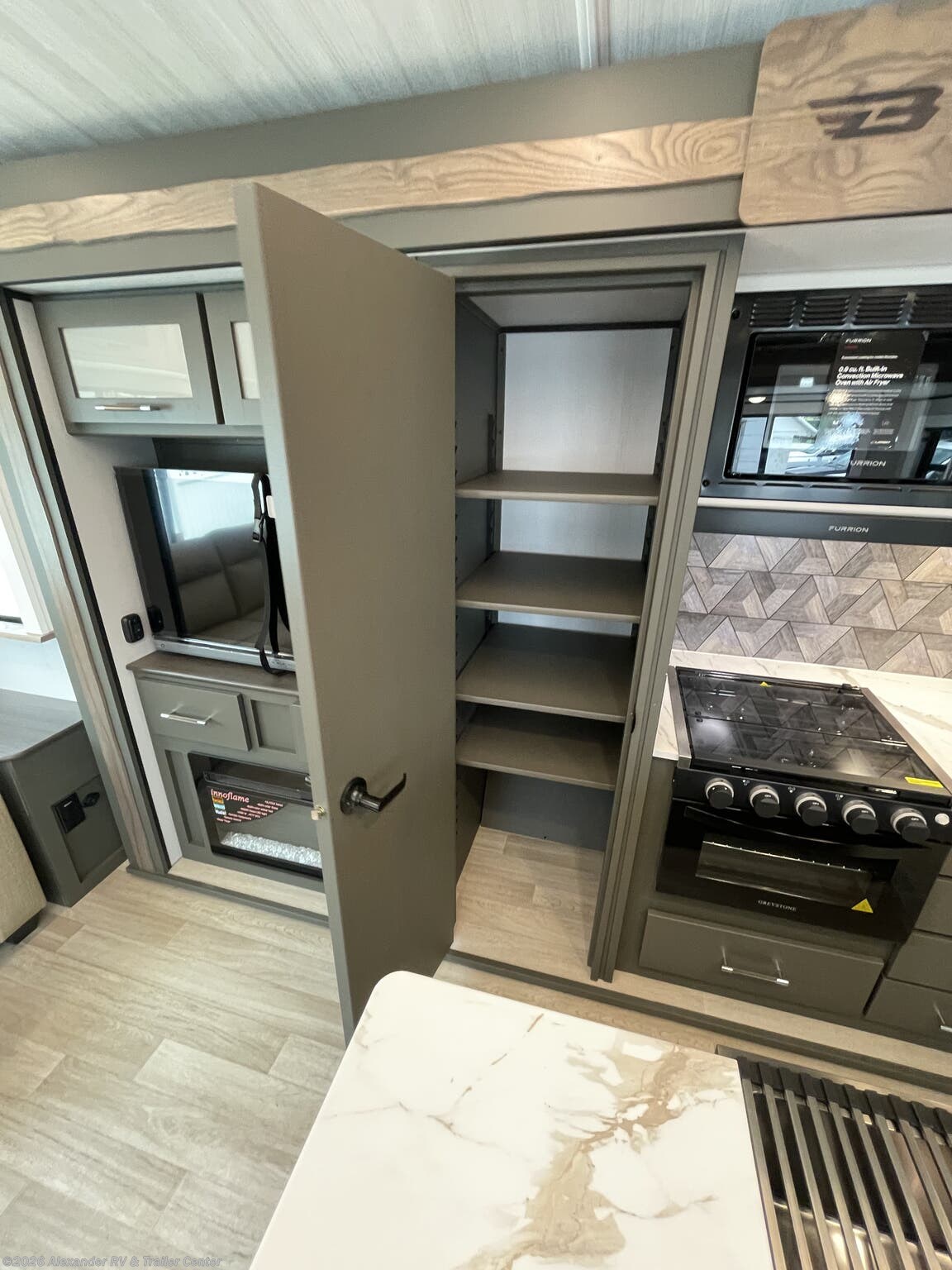 Fireplace, Island Kitchen, Medicine Cabinet, Pantry, Queen Bed, Roof Vents, Shower, Table and Chairs, Theater Seating, Toilet -