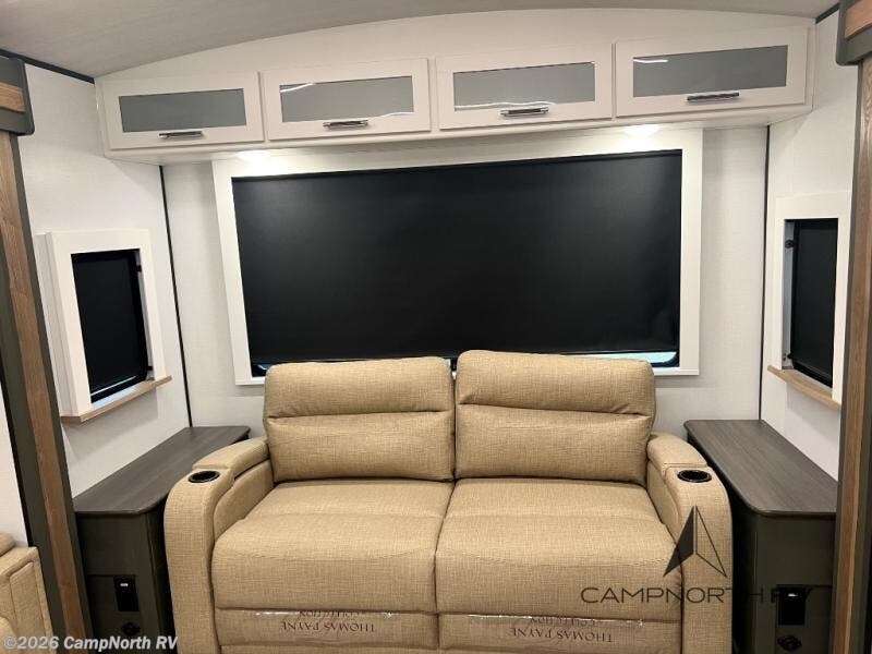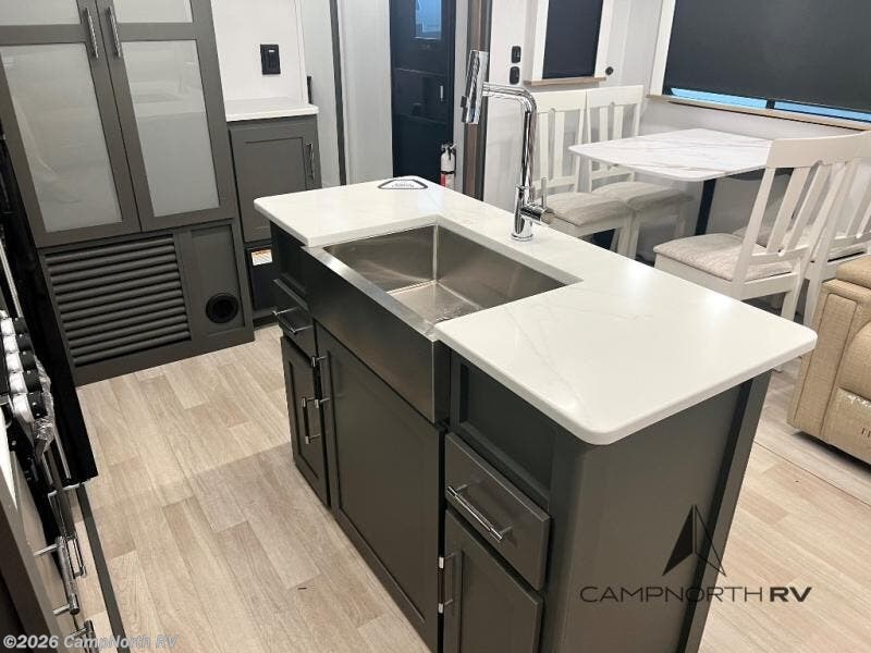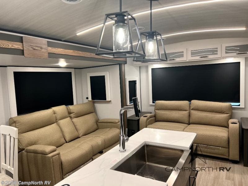 The rear living area creates a true lounge setup for relaxing or entertaining, while the opposing slides maximize interior width. The private front bedroom with king bed slide and washer dryer prep makes this a strong option for extended camping or seasonal sites.
