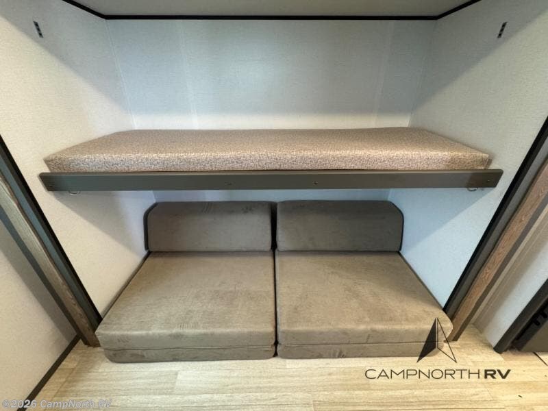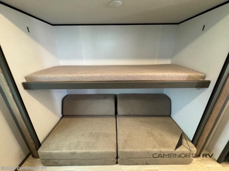 The rear private bunkhouse suite is perfect for kids or guests, featuring a tri-fold sofa, flip-up bunk, and additional bunk, along with a half bath that includes its own exterior entry door—a huge convenience for families at the campsite.