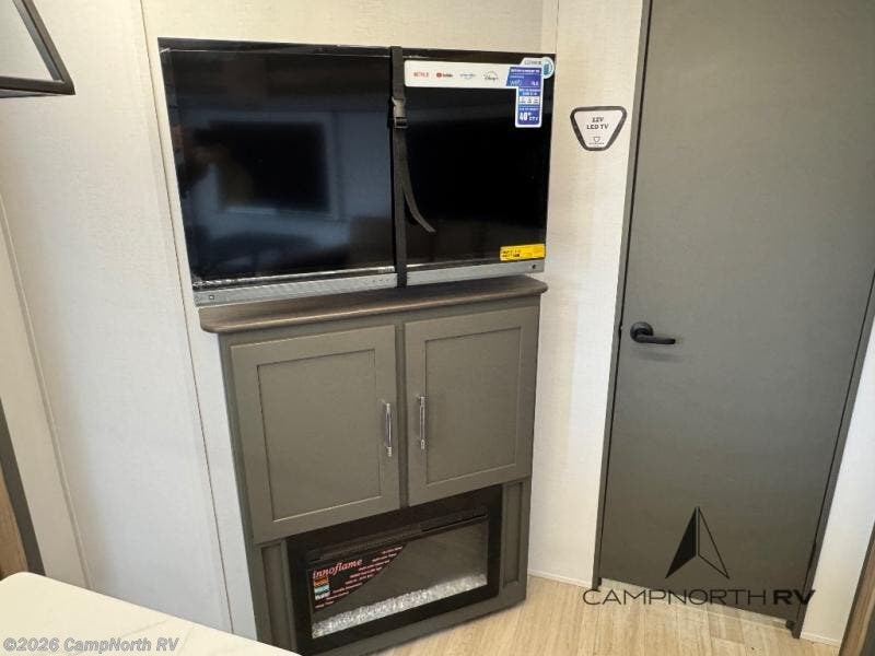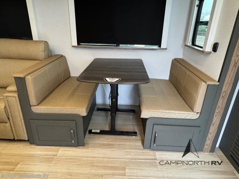 The main living area features dual opposing slide-outs, creating an open and spacious layout for relaxing and entertaining. Enjoy comfortable seating on the tri-fold sofa and Do-More dinette, all positioned near the fireplace and entertainment center for a cozy, residential feel.