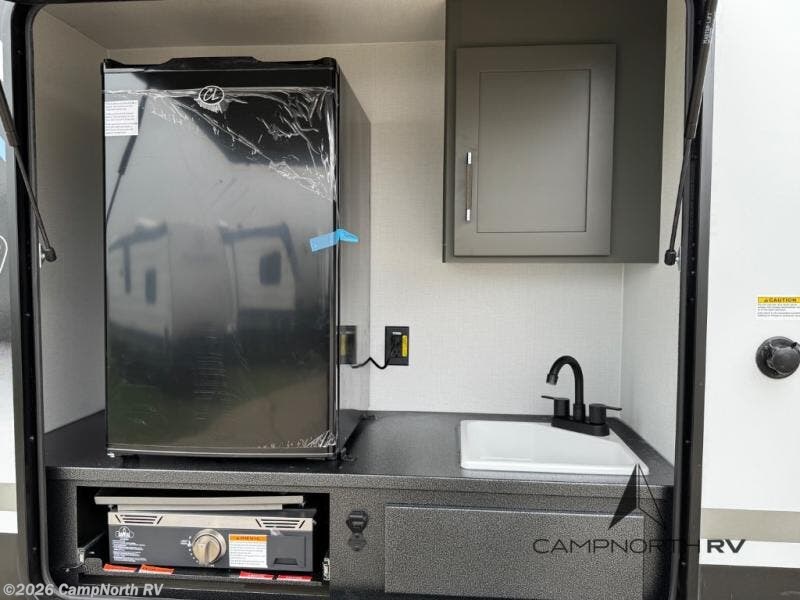 Outside, the exterior kitchen adds convenience for outdoor cooking, while the dual entry doors make it easy to access both the main living area and bathroom.
