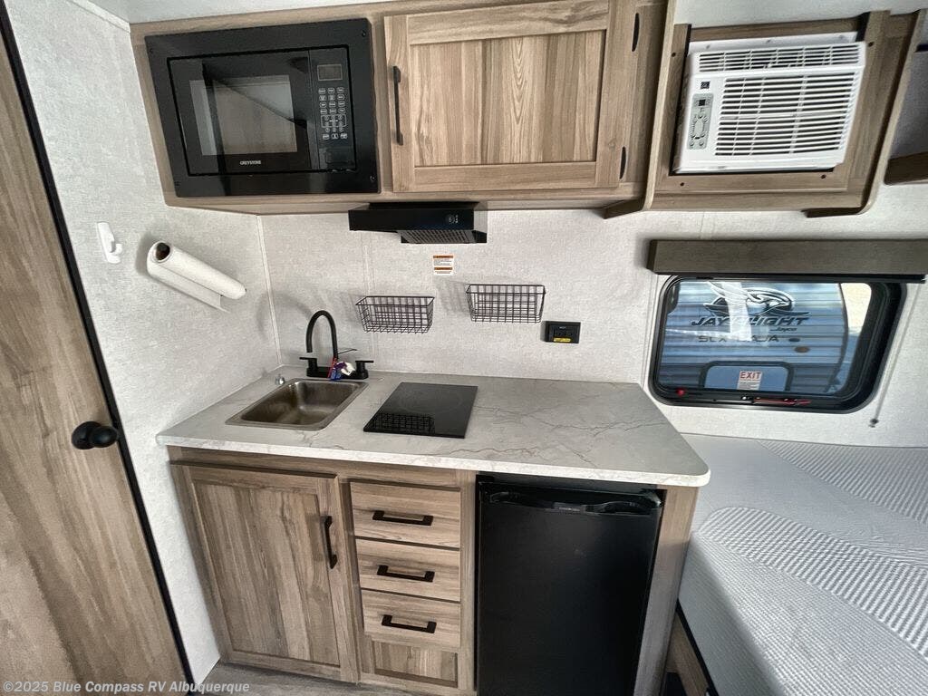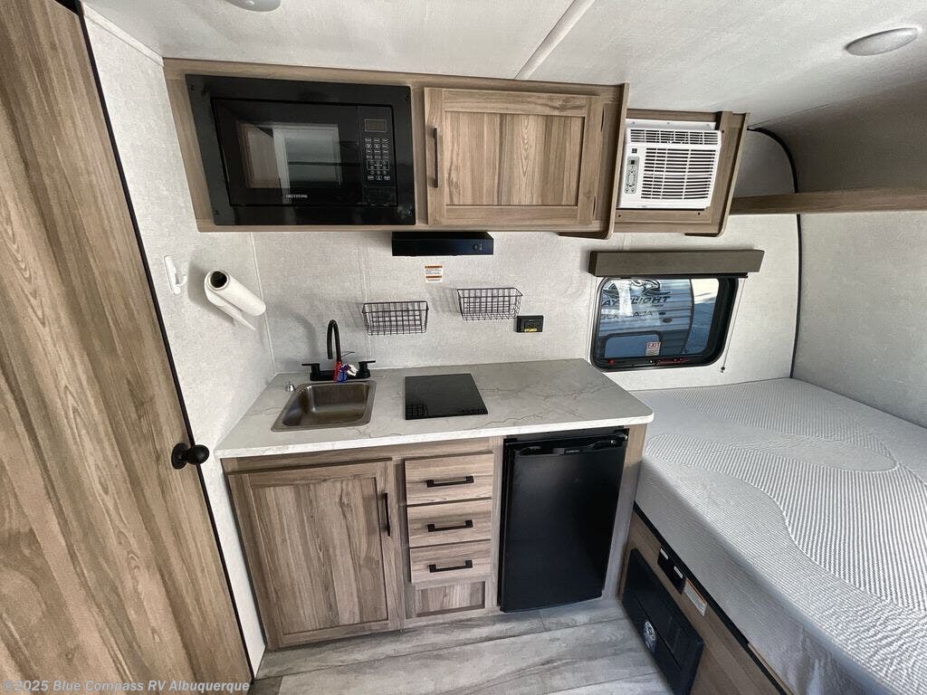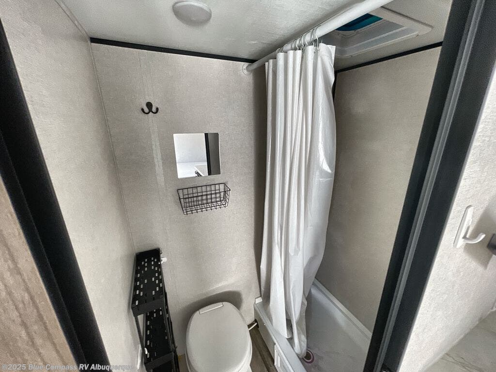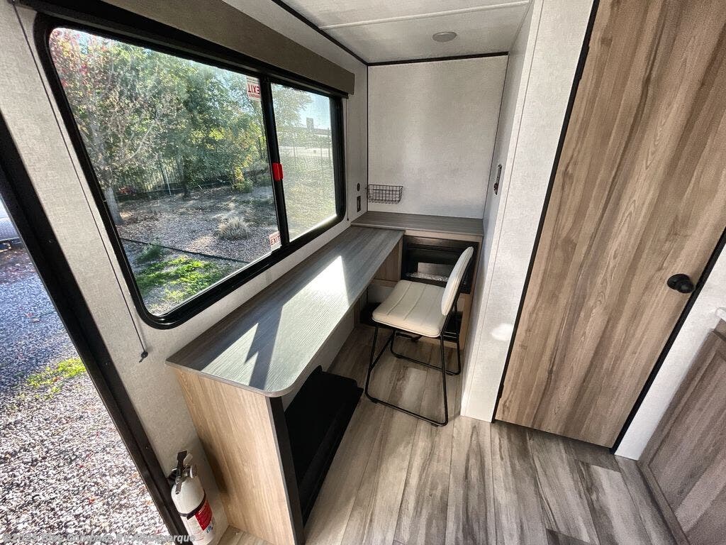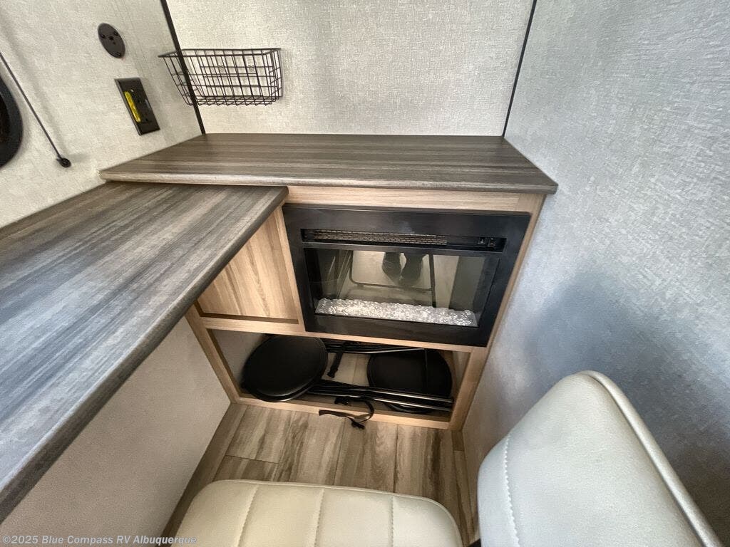 This travel trailer is perfect for a couple. The beautifully appointed bathroom is fully equipped for your needs, providing a serene space to unwind. The cozy fireplace creates a warm and welcoming atmosphere, perfect for relaxing with loved ones. The stylish bar with stools is great for socializing and enjoying meals. In the kitchen, the convenient microwave enables quick and easy meal preparation, while the spacious refrigerator keeps your food and drinks fresh. The ample overhead cabinets provide plenty of storage space, and the single burner cooktop gives you the freedom to cook your favorite homemade dishes. The plush queen bed is the perfect spot to rest and recharge, and the practical shelf provides additional storage for your favorite books, decorations, or personal items. The practical exterior features include a durable exterior awning that provides shade and protection from the elements, while the spacious exterior storage offers ample space for your outdoor gear and equipment.