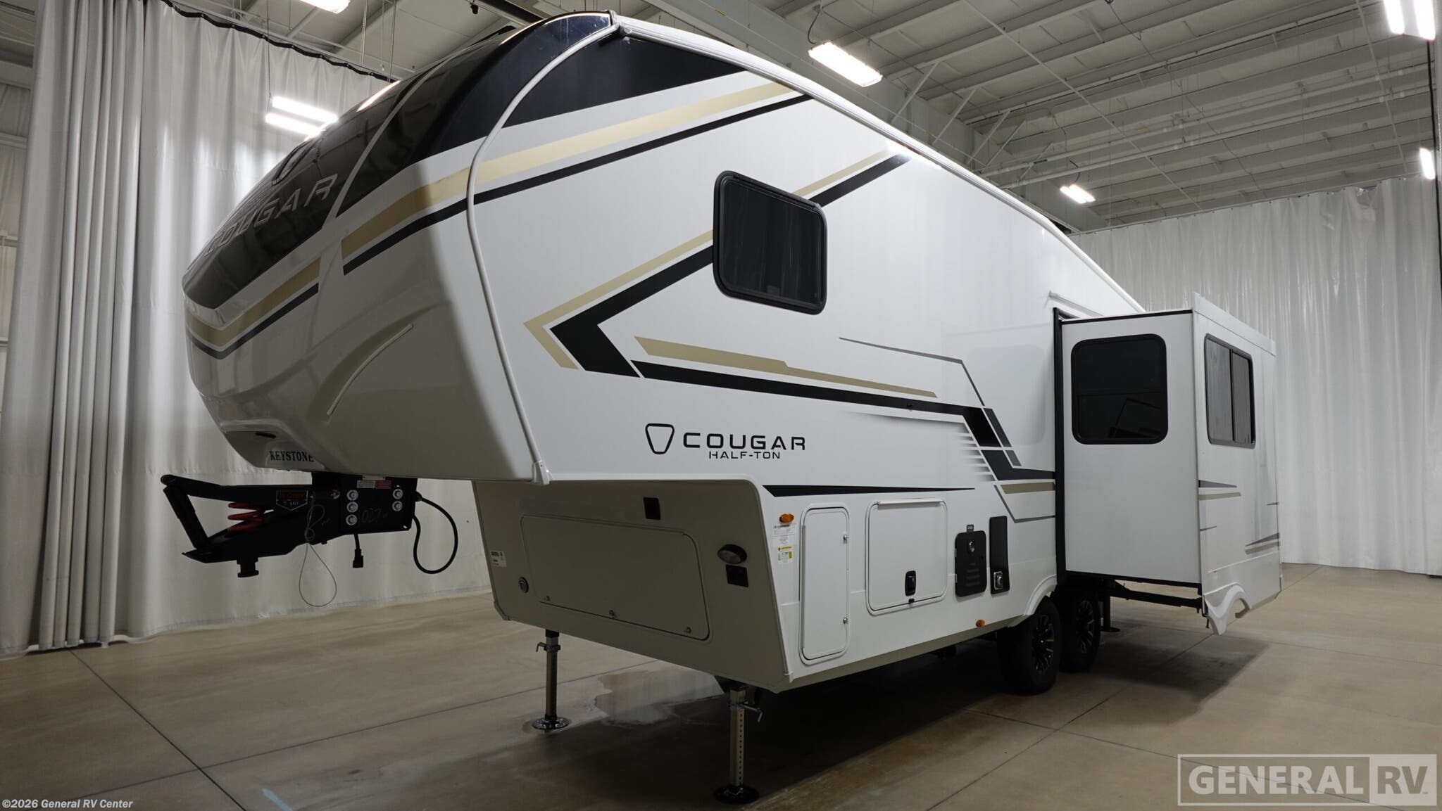 Discover the 2026 Keystone Cougar Half-Ton 23MLE, a perfect blend of comfort and adventure, designed for those who crave the open road without sacrificing the comforts of home. This RV welcomes you with a thoughtfully designed rear kitchen, featuring a full-size electric refrigerator and a three-burner cooktop, making meal preparation a breeze. The center living area is both cozy and functional, with a 68" tri-fold sleeper sofa and a booth dinette that easily converts for additional sleeping space, accommodating up to six guests comfortably. The center bath offers convenience and privacy, equipped with a sleek plastic and glass shower. As you move to the front, you'll find a tranquil bedroom with a plush queen bed, surrounded by ample wardrobe space and nightstands for all your essentials. The exterior is just as impressive, boasting a 16 ft. powered retractable awning, perfect for enjoying the great outdoors, rain or shine. With a dry weight of 7,778 lbs and a cargo capacity of 2,122 lbs, this RV is ready to handle all your travel needs. Visit your nearest General RV dealership to explore this exceptional model in person and start your next adventure!