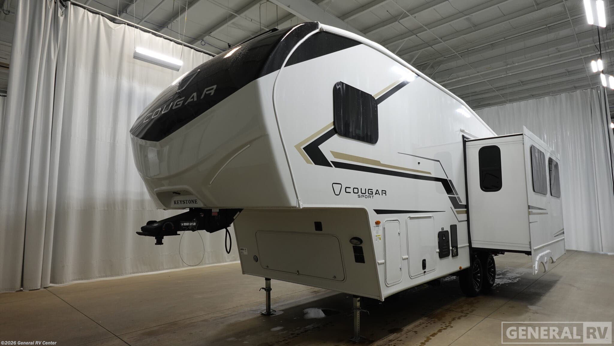 Experience the perfect blend of comfort and adventure with the 2026 Keystone Cougar Sport 2400RE. This thoughtfully designed RV invites you to explore the open road without sacrificing the comforts of home. With a length of just over 29 feet, it offers a spacious retreat featuring a cozy front bedroom with a queen bed and ample wardrobe space, ensuring restful nights after a day of exploration. The rear living area is a haven for relaxation, boasting theater seating and a dinette that easily converts for additional sleeping space, accommodating up to four guests. The Cougar Sport's center kitchen is a culinary delight, equipped with a full-size electric refrigerator and a three-burner cooktop, perfect for whipping up your favorite meals. Enjoy the convenience of a 16-foot powered retractable awning, providing the ideal outdoor space for dining or simply soaking in the scenery. With a generous fresh water capacity of 54 gallons and smart storage solutions, this RV is ready for extended journeys. Whether you're embarking on a weekend getaway or a cross-country adventure, the Cougar Sport 2400RE promises a memorable and comfortable travel experience. For more information, visit your nearest General RV Dealership.