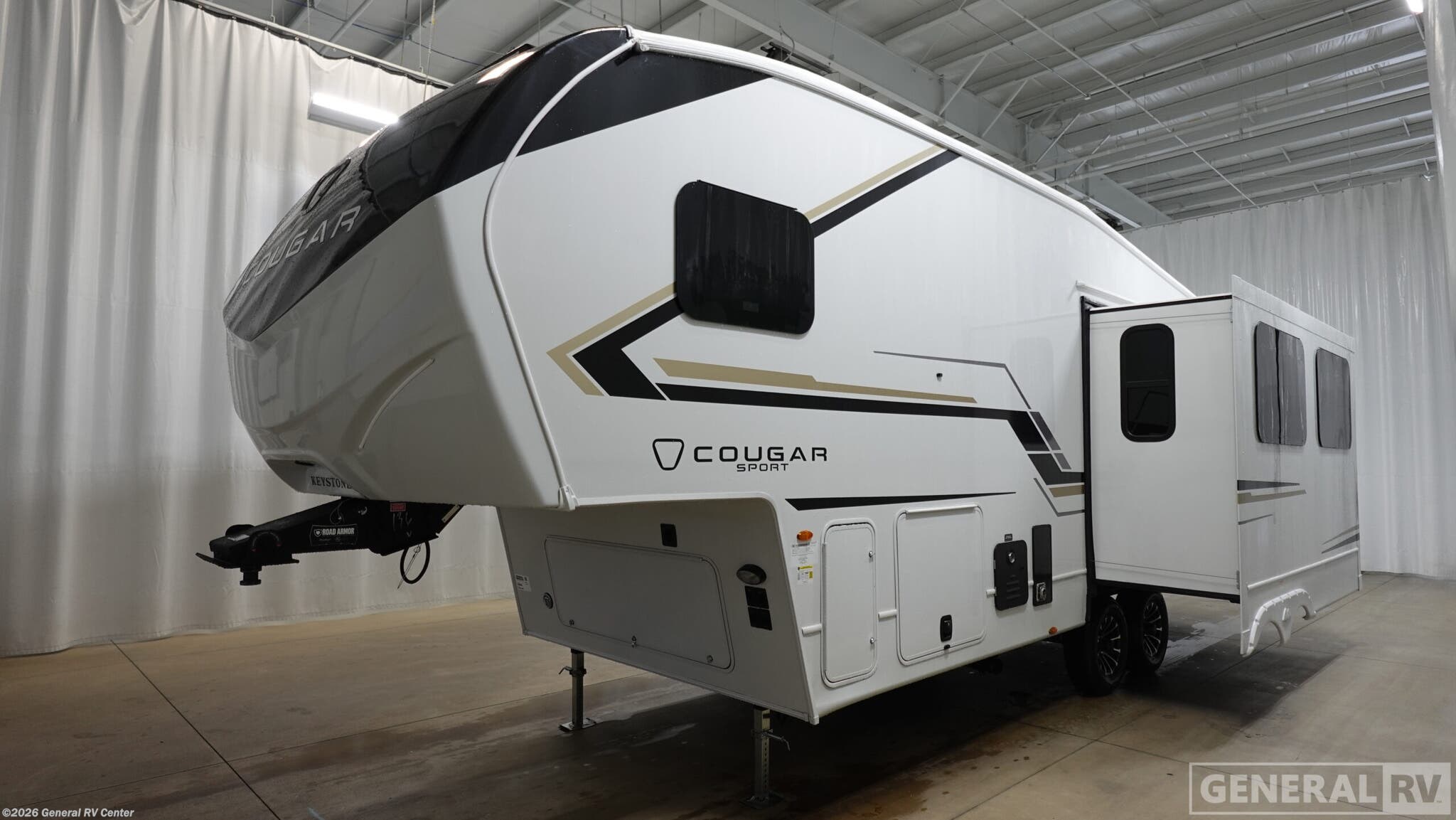 Experience the perfect blend of comfort and adventure with the 2026 Keystone Cougar Sport 2400RE. This thoughtfully designed RV invites you to explore the open road without sacrificing the comforts of home. With a length of just over 29 feet, it offers a spacious retreat featuring a cozy front bedroom with a queen bed and ample wardrobe space, ensuring restful nights after a day of exploration. The Cougar Sport's center kitchen is a culinary delight, equipped with a full-size electric refrigerator and a three-burner cooktop, perfect for whipping up your favorite meals. Enjoy the convenience of a 16-foot powered retractable awning, providing the ideal outdoor space for dining or simply soaking in the scenery. With a generous fresh water capacity of 54 gallons and smart storage solutions, this RV is ready for extended journeys. Whether you're embarking on a weekend getaway or a cross-country adventure, the Cougar Sport 2400RE promises a memorable and comfortable travel experience. For more information, visit your nearest General RV Dealership.
