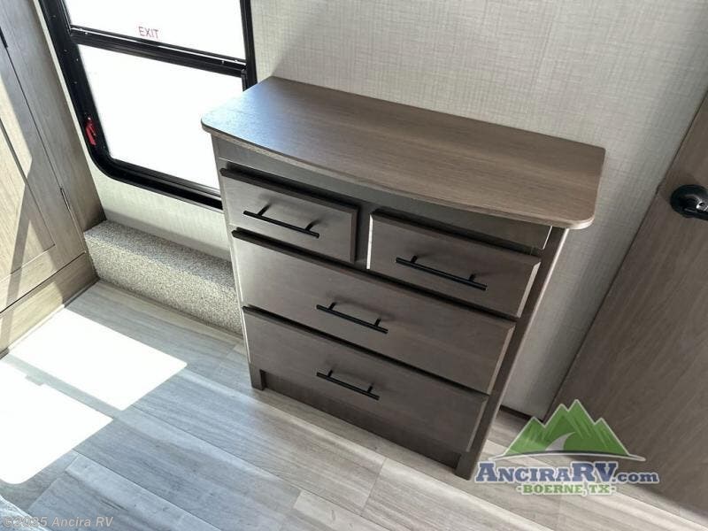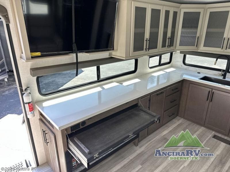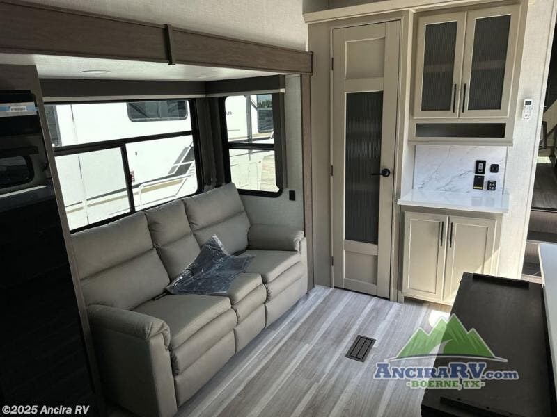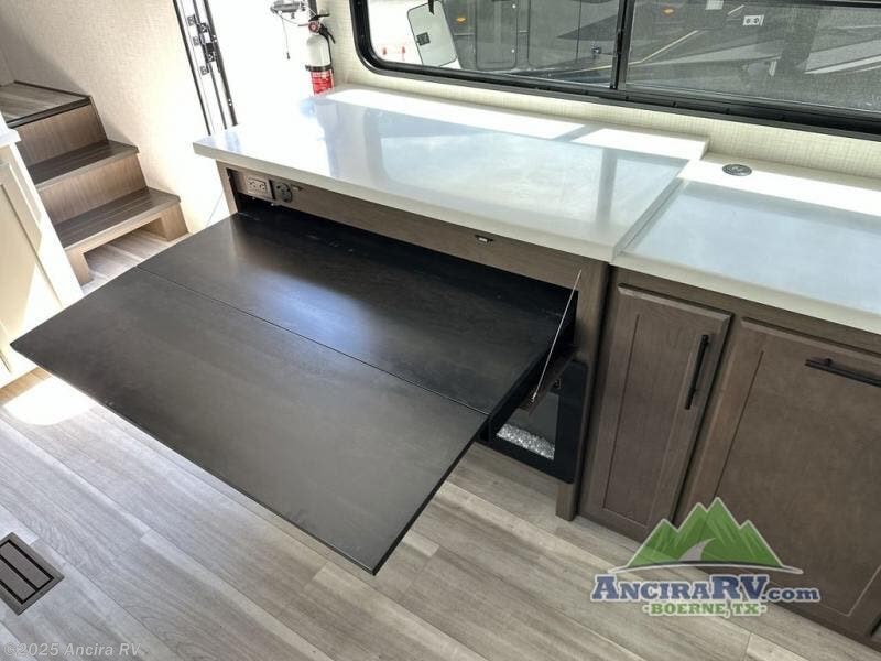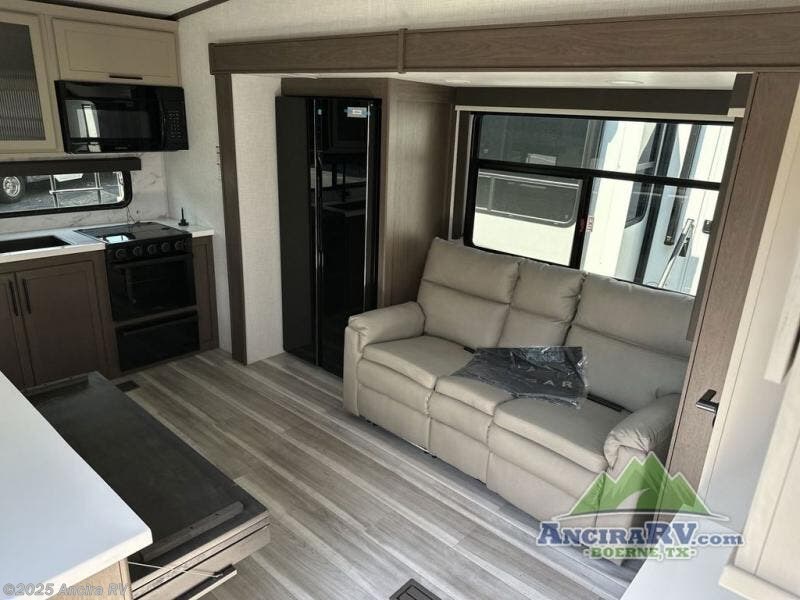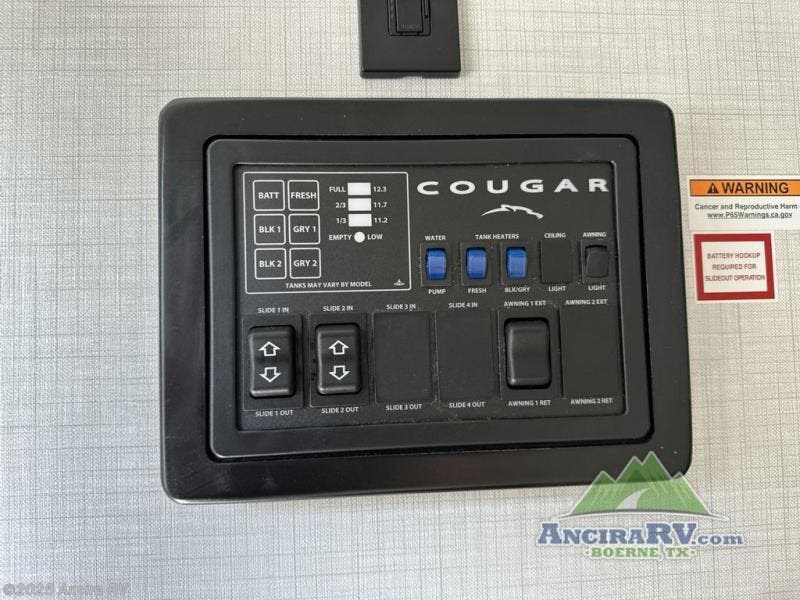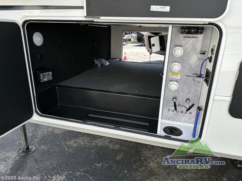 This fifth wheel is packed with premium features you won't want to camp without. You'll feel at home in the front private bedroom with its queen bed slide out with storage underneath, full-height wardrobe, plus a wardrobe with washer and dryer prep. There is even dresser with a sliding top with hidden storage for your valuables. If you have any guests, they can sleep on the tri-fold sleeper sofa within the living room slide, and there is a fireplace and LED HDTV here in perfect view for movie nights. This Cougar fifth wheel features a rear kitchen with tons of counter space, a convenient pull out trash can, and a high-rise chef's faucet and sprayer. The pull-out table in front of the fireplace will provide a place to dine at, or you can sit outdoors under the 20' power awning, and you'll also find an outside refrigerator to keep drinks stocked!