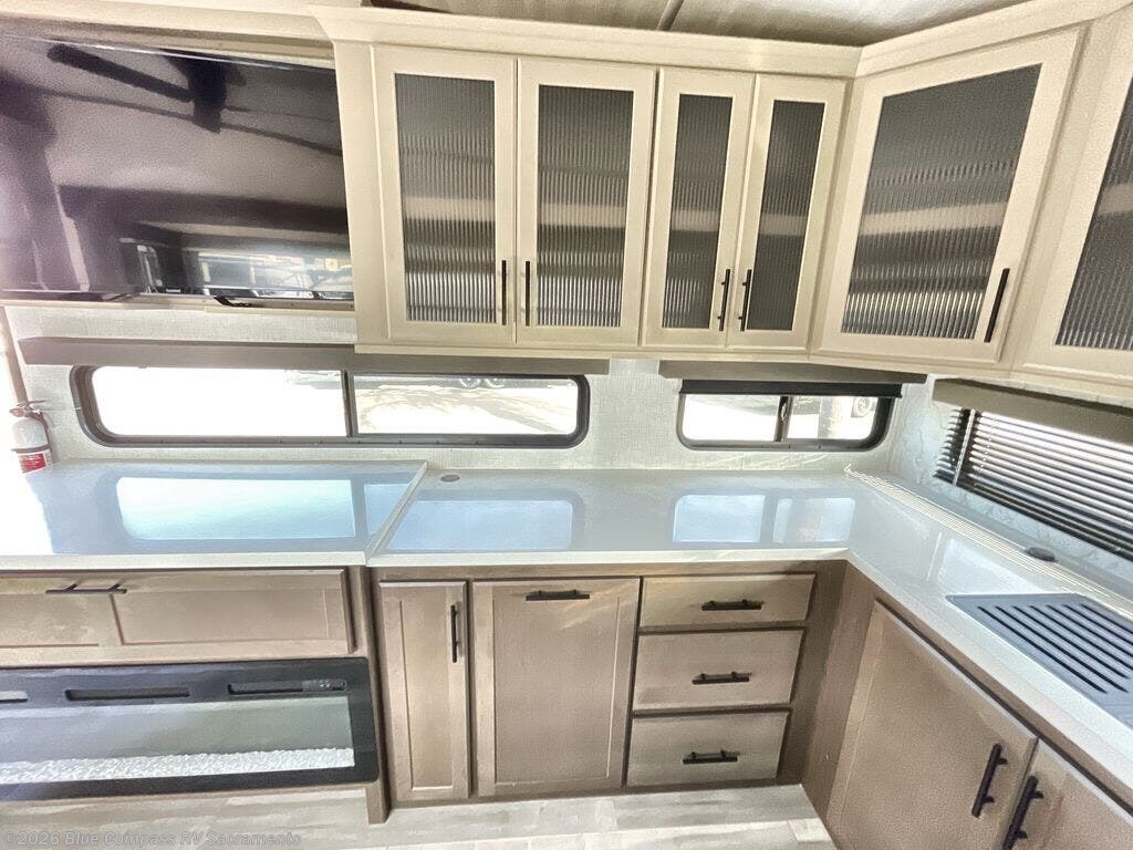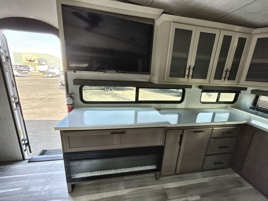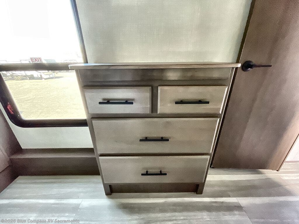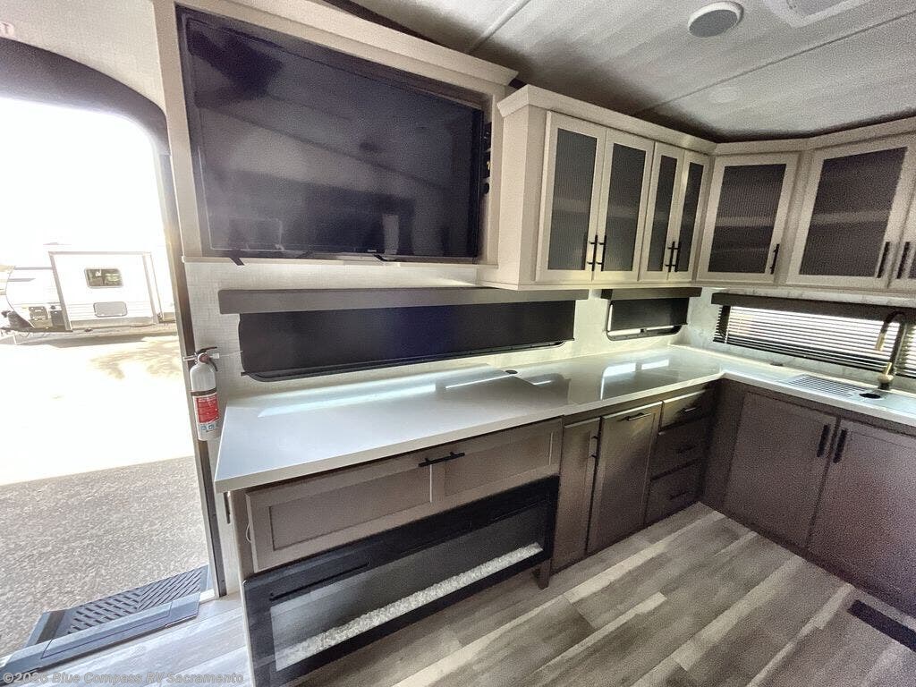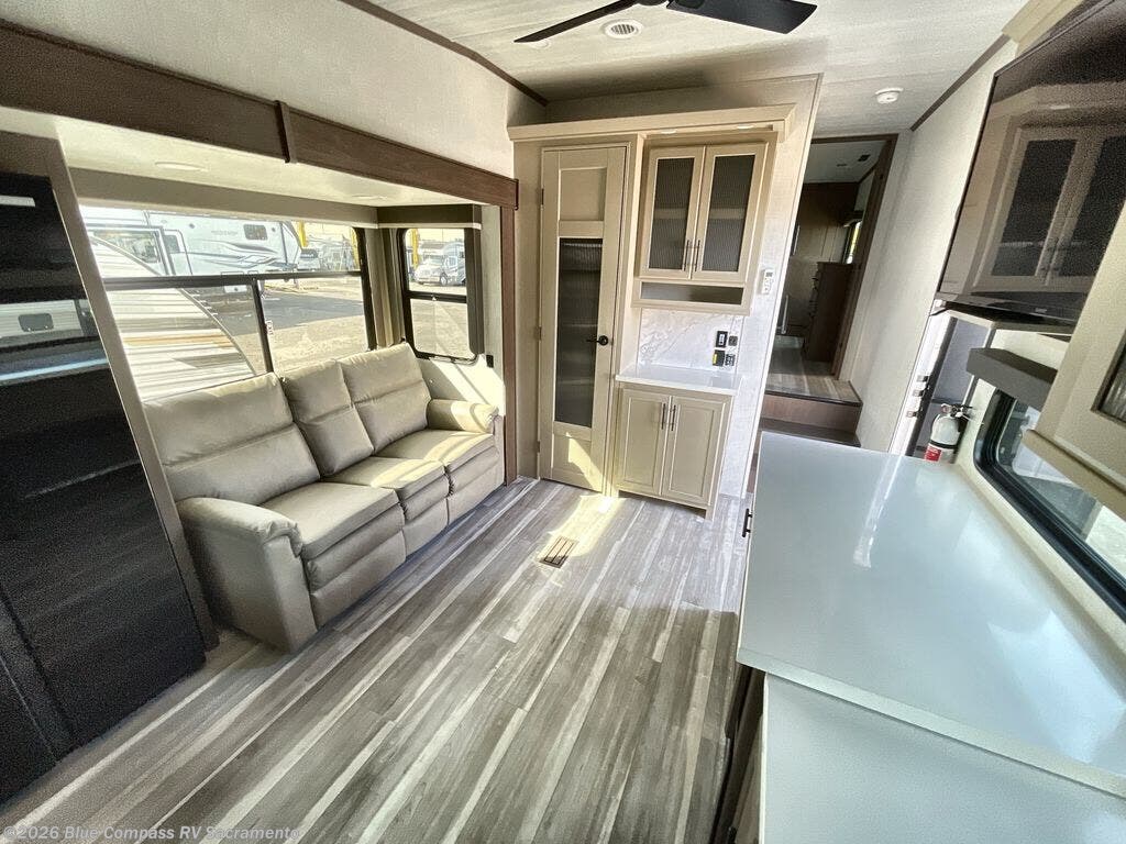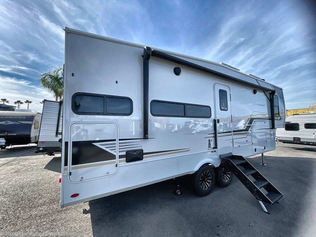 This fifth wheel is packed with premium features you won't want to camp without. You'll feel at home in the front private bedroom with its queen bed slide out with storage underneath, full-height wardrobe, plus a wardrobe with washer and dryer prep. There is even dresser with a sliding top with hidden storage for your valuables. If you have any guests, they can sleep on the tri-fold sleeper sofa within the living room slide, and there is a fireplace and LED HDTV here in perfect view for movie nights. This Cougar fifth wheel features a rear kitchen with tons of counter space, a convenient pull out trash can, and a high-rise chef's faucet and sprayer. The pull-out table in front of the fireplace will provide a place to dine at, or you can sit outdoors under the 20' power awning, and you'll also find an outside refrigerator to keep drinks stocked!