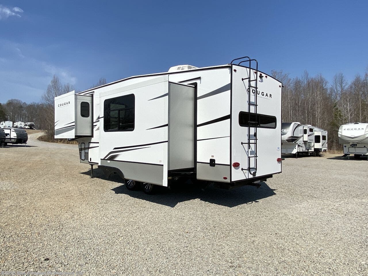 This fifth wheel is packed with premium features you won't want to camp without. You'll feel at home in the front private bedroom with its queen bed slide out with storage underneath, full-height wardrobe, plus a wardrobe with washer and dryer prep. There is even dresser with a sliding top with hidden storage for your valuables. If you have any guests, they can sleep on the tri-fold sleeper sofa within the living room slide, and there is a fireplace and LED HDTV here in perfect view for movie nights. This Cougar fifth wheel features a rear kitchen with tons of counter space, a convenient pull out trash can, and a high-rise chef's faucet and sprayer. The pull-out table in front of the fireplace will provide a place to dine at, or you can sit outdoors under the 20' power awning, and you'll also find an outside refrigerator to keep drinks stocked!
