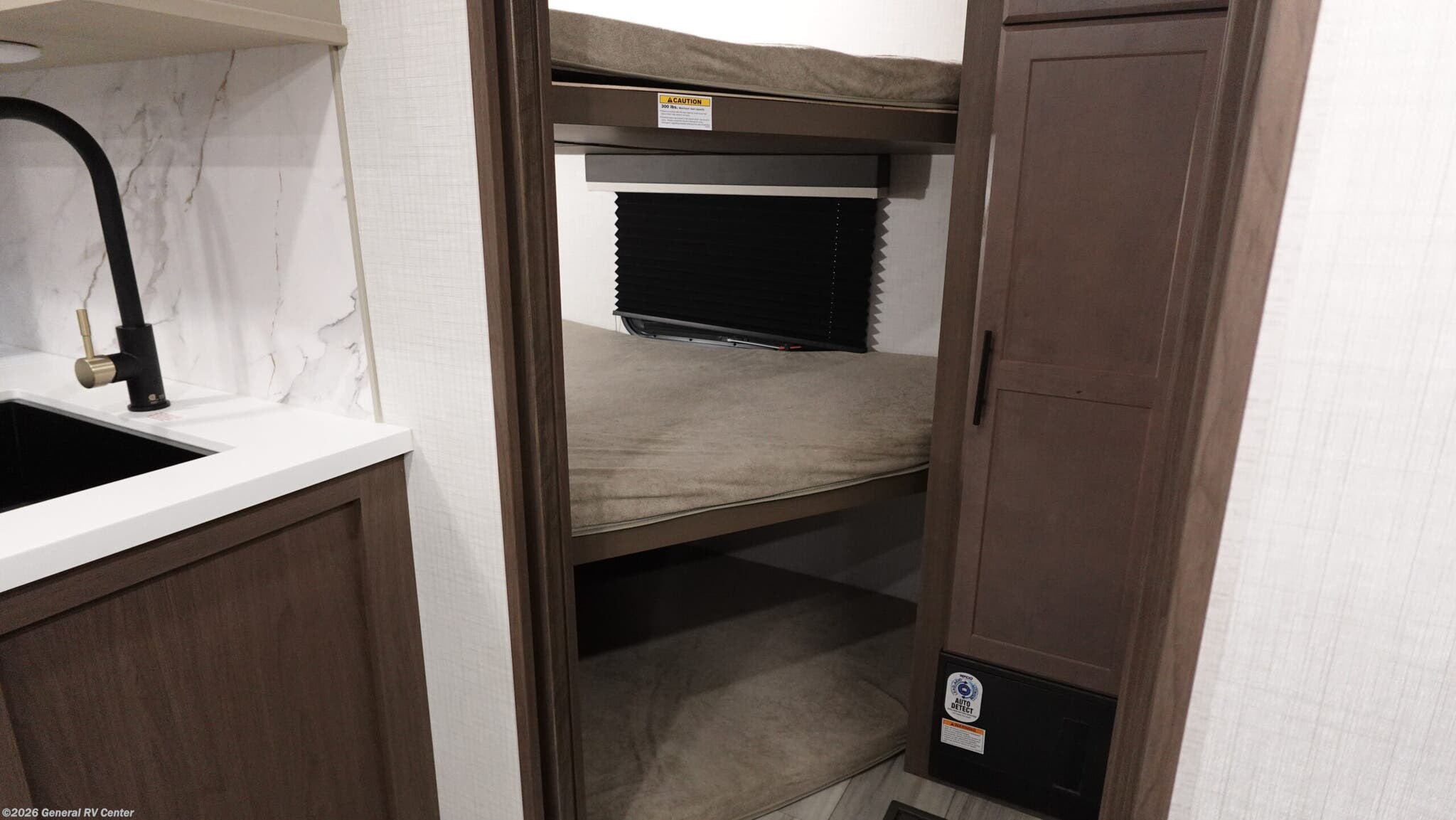 Discover the 2026 Keystone Cougar Sport 2700BH, a travel trailer designed to make every adventure memorable. With a length of just over 32 feet, this RV is spacious enough to comfortably accommodate up to nine people. The layout is perfect for families or groups, featuring a front queen bedroom for privacy and a cozy bunkhouse at the rear with three bunks. The center kitchen and living area create a welcoming space to gather, complete with a convertible dinette and a tri-fold sleeper sofa for additional sleeping options. The full-size electric refrigerator ensures you have plenty of space for all your culinary needs, while the three-burner cooktop makes meal prep a breeze. The Cougar Sport 2700BH is designed with convenience in mind. Enjoy the ease of a powered 20-foot retractable awning, perfect for relaxing outdoors. The pass-thru storage offers ample space for all your gear, making it easy to pack for extended trips. Inside, the automatic heater keeps you warm on chilly nights, and the thoughtfully designed bathroom with a plastic/glass shower ensures comfort on the road. With a GVWR of 9500 lbs and a cargo capacity of 1920 lbs, this travel trailer is both robust and versatile. For more details and to experience this RV firsthand, visit your nearest General RV dealership.