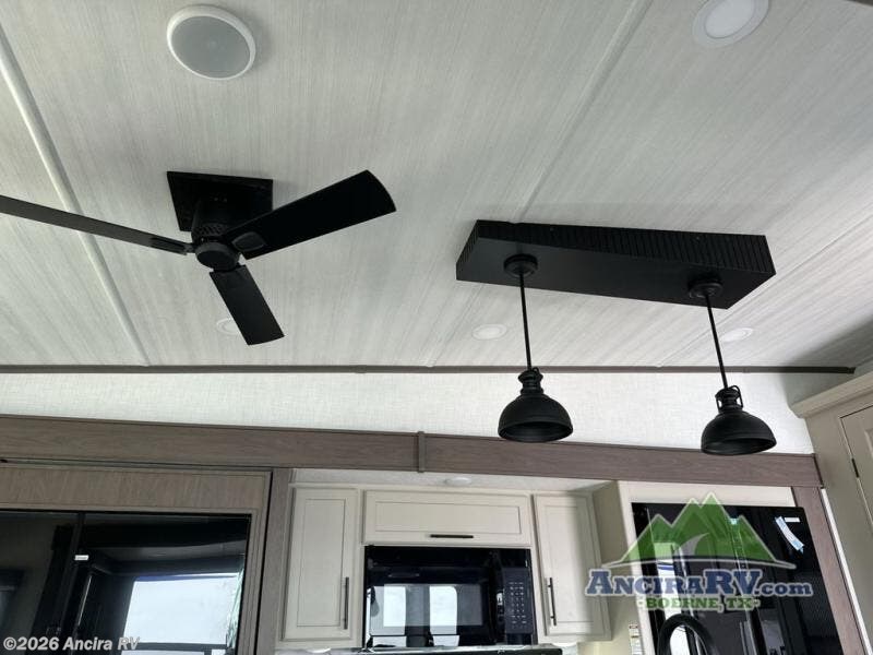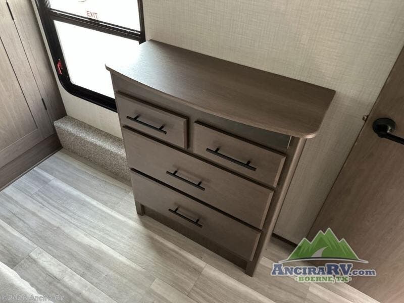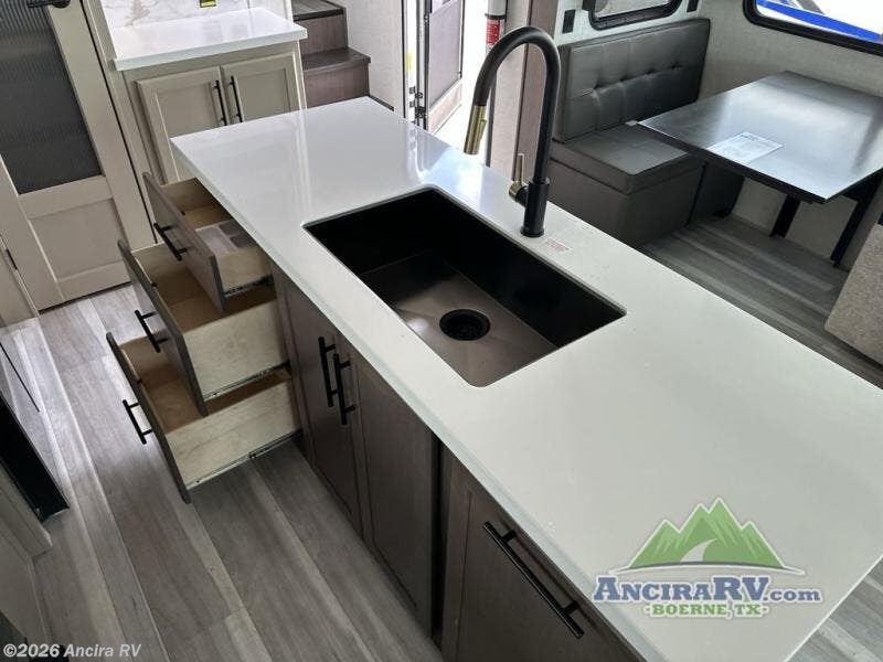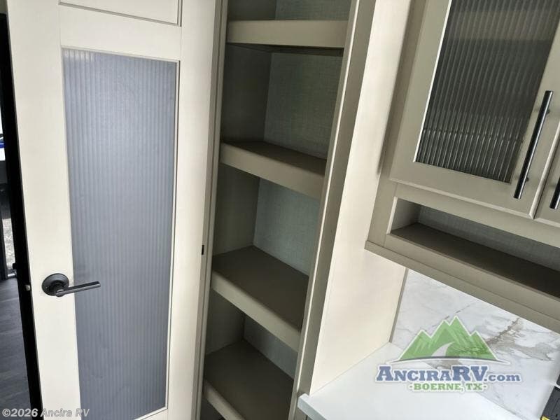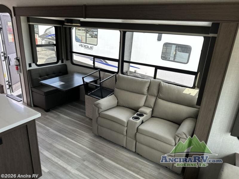 The dual opposing slides in the combined kitchen and living area will give you an open floorplan! You'll sleep on the queen-size bed in the front private bedroom, and there is under-bed storage, a full-height wardrobe, and a dresser with hidden storage for all of your personal belongings. As you spend time in the main living area, you'll appreciate having extra space thanks to the set of opposing slides, and the kitchen island will be easy to work around. You'll be able to relax on the tri-fold sleeper sofa and theater seating while you watch the LED HDTV with an pivoting entertainment door and hidden pantry. There is also a booth dinette with storage drawers, convenient shoe storage right as you enter the unit, and an exterior unobstructed pass-thru storage so nothing gets left behind.