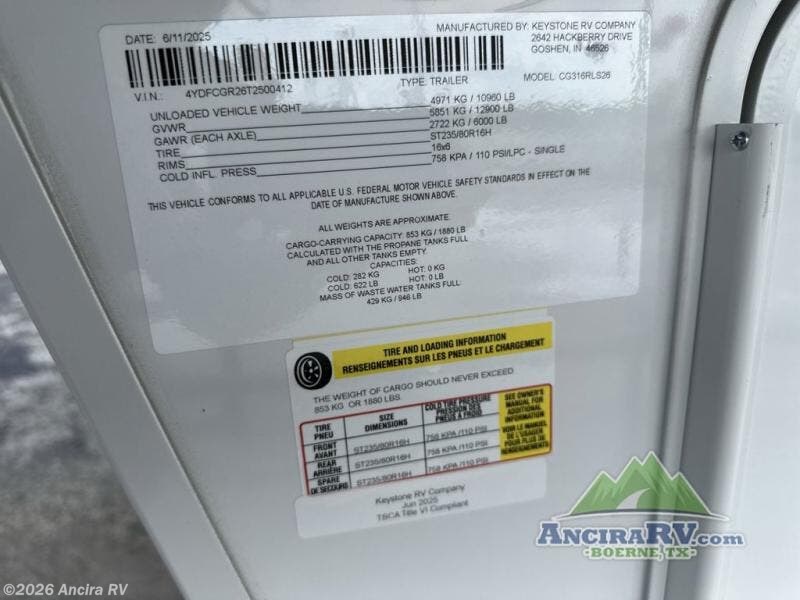 2026 Keystone Cougar 316RLS Specifications