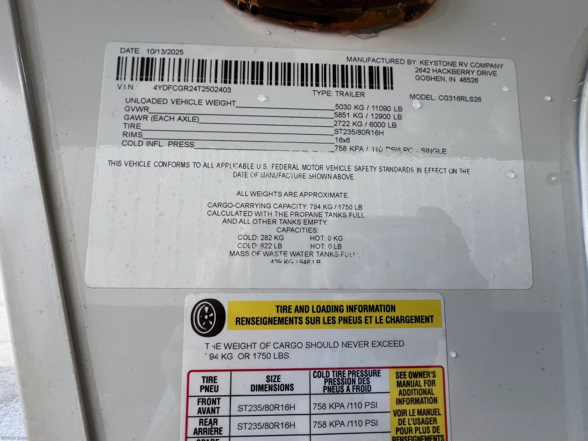 This 2026 Keystone Cougar 316RLS is an RV the whole family will love. Ready to be a proud Keystone owner? This 2026 Keystone Cougar 316RLS is the perfect fit. If you’re looking for a family RV, you’ve found it: this rig sleeps 4. With three slides, this rig feels roomy and spacious inside. The fridge, stove make the perfect combo for eating well on the road. The TV make it easy to spend time together as a family. Traveling couples love this rig thanks to the queen bed. If you like your rig cool in the summer and warm in winter, this heating option can do the trick. If you’re thinking of heading off grid, this rig has a 75 fresh water tank. While the inside of this rig is enough on its own, the outside also features awning, hitch, ladder, skylight and slideout.