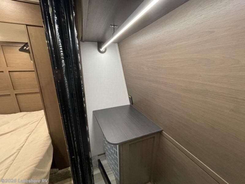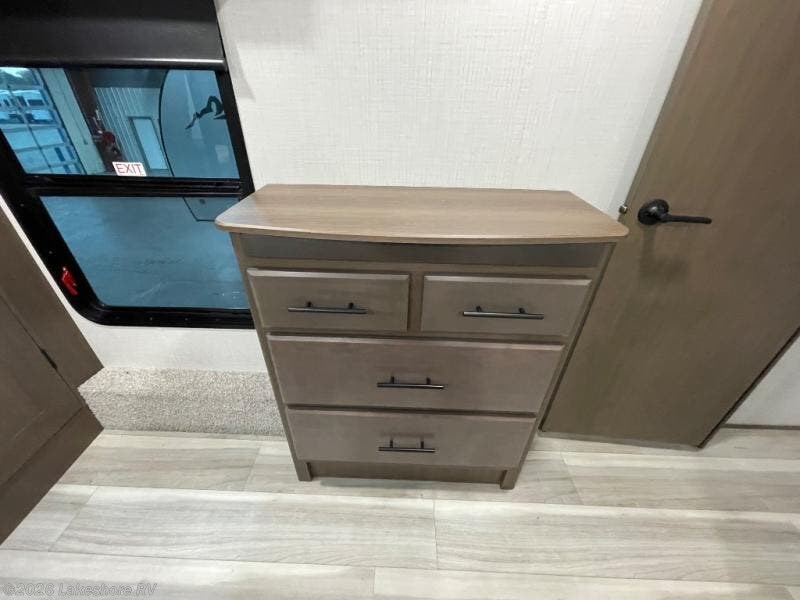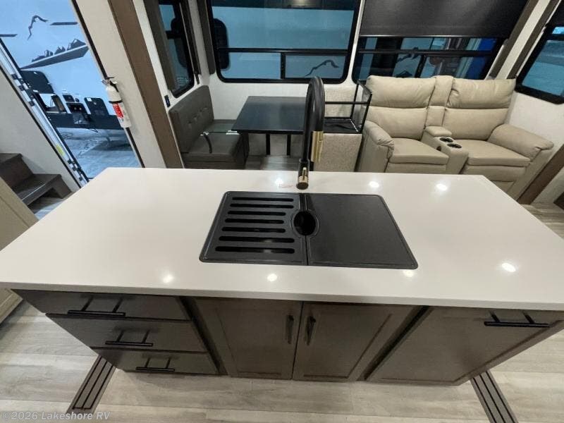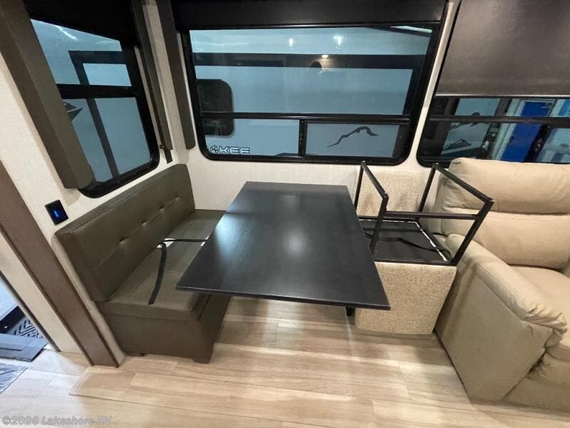The dual opposing slides in the combined kitchen and living area will give you an open floorplan! You'll sleep on the queen-size bed in the front private bedroom, and there is under-bed storage, a full-height wardrobe, and a dresser with hidden storage for all of your personal belongings. As you spend time in the main living area, you'll appreciate having extra space thanks to the set of opposing slides, and the kitchen island will be easy to work around. You'll be able to relax on the tri-fold sleeper sofa and theater seating while you watch the LED HDTV with an pivoting entertainment door and hidden pantry. There is also a booth dinette with storage drawers, convenient shoe storage right as you enter the unit, and an exterior unobstructed pass-thru storage so nothing gets left behind.