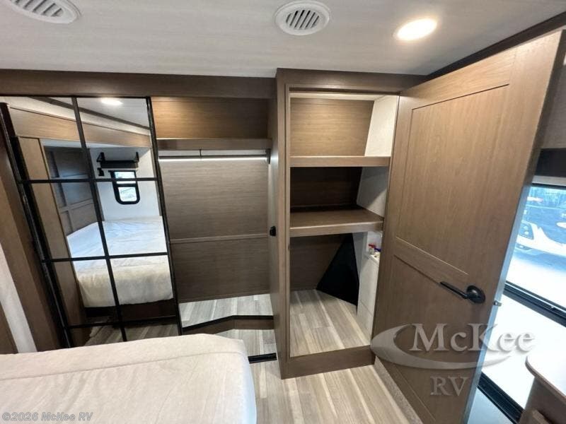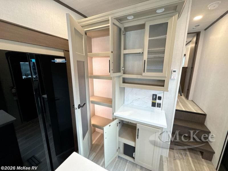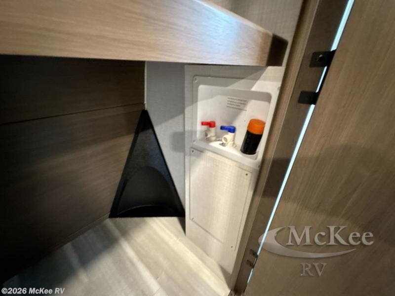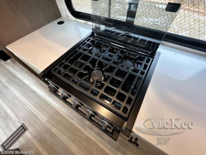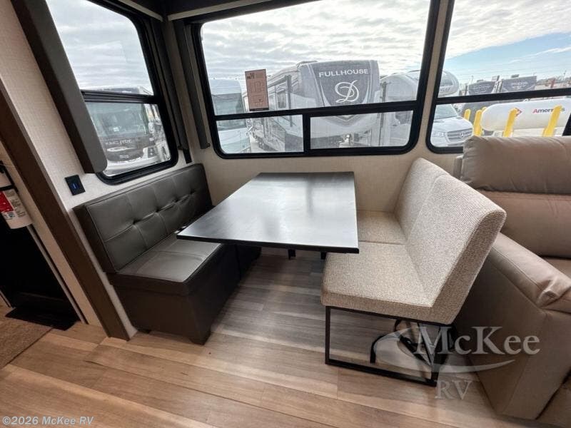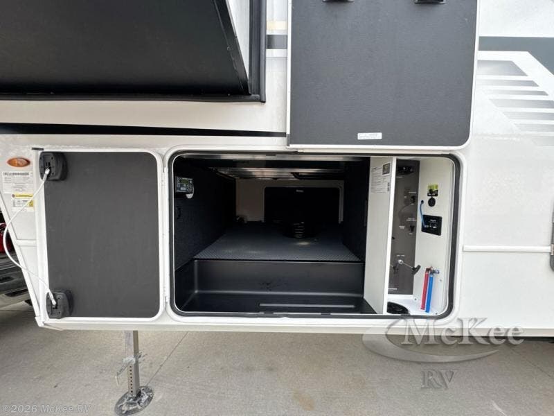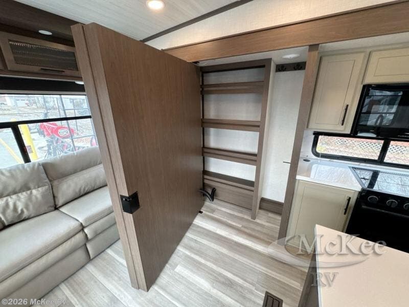 The dual opposing slides in the combined kitchen and living area will give you an open floorplan! You'll sleep on the queen-size bed in the front private bedroom, and there is under-bed storage, a full-height wardrobe, and a dresser with hidden storage for all of your personal belongings. As you spend time in the main living area, you'll appreciate having extra space thanks to the set of opposing slides, and the kitchen island will be easy to work around. You'll be able to relax on the tri-fold sleeper sofa and theater seating while you watch the LED HDTV with an pivoting entertainment door and hidden pantry. There is also a booth dinette with storage drawers, convenient shoe storage right as you enter the unit, and an exterior unobstructed pass-thru storage so nothing gets left behind.