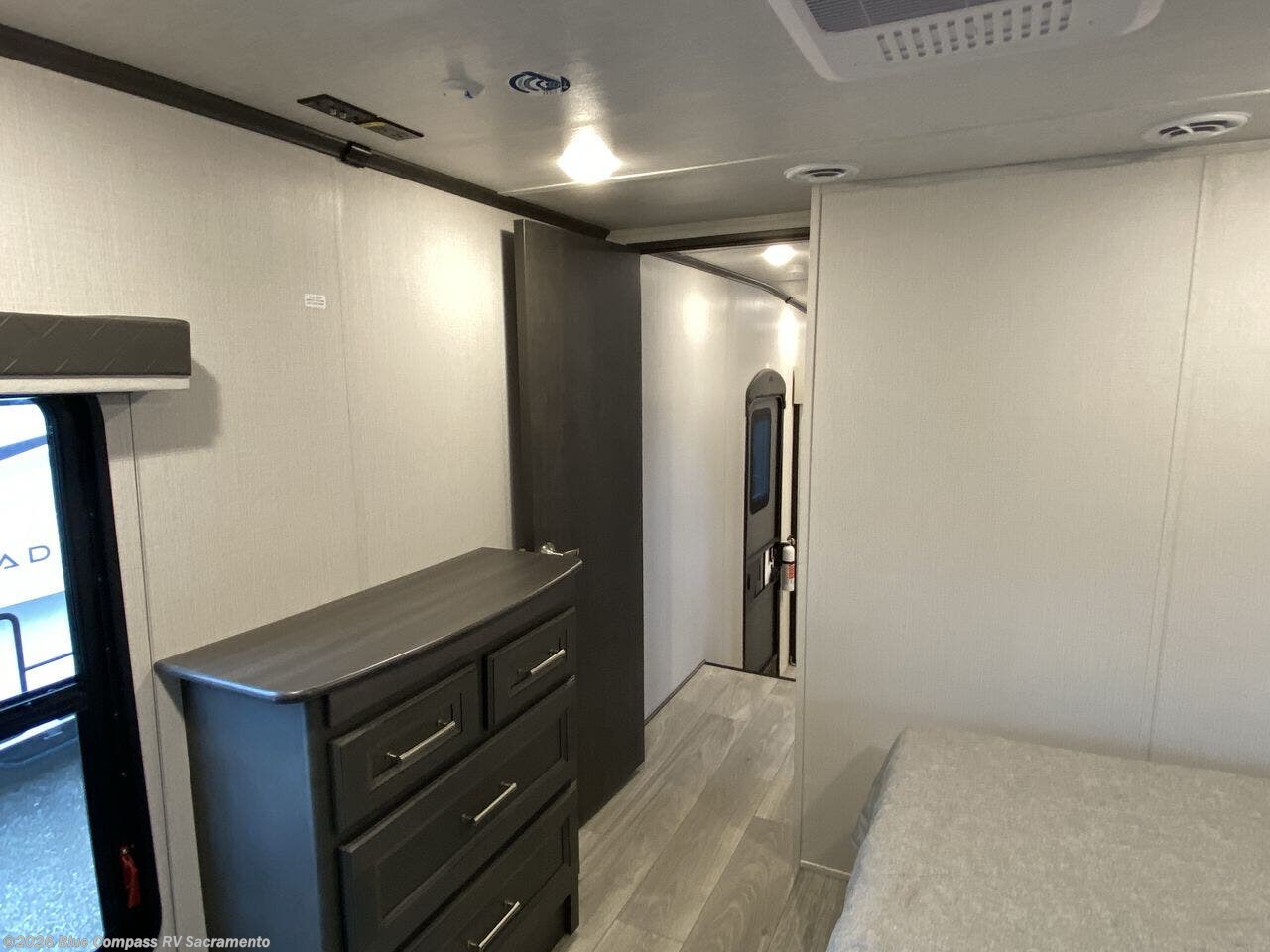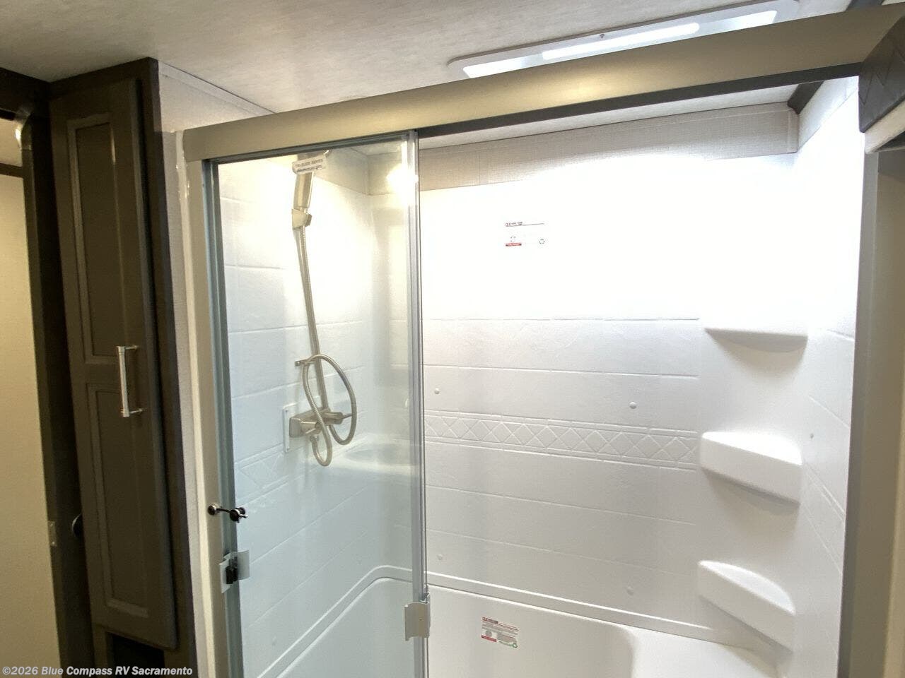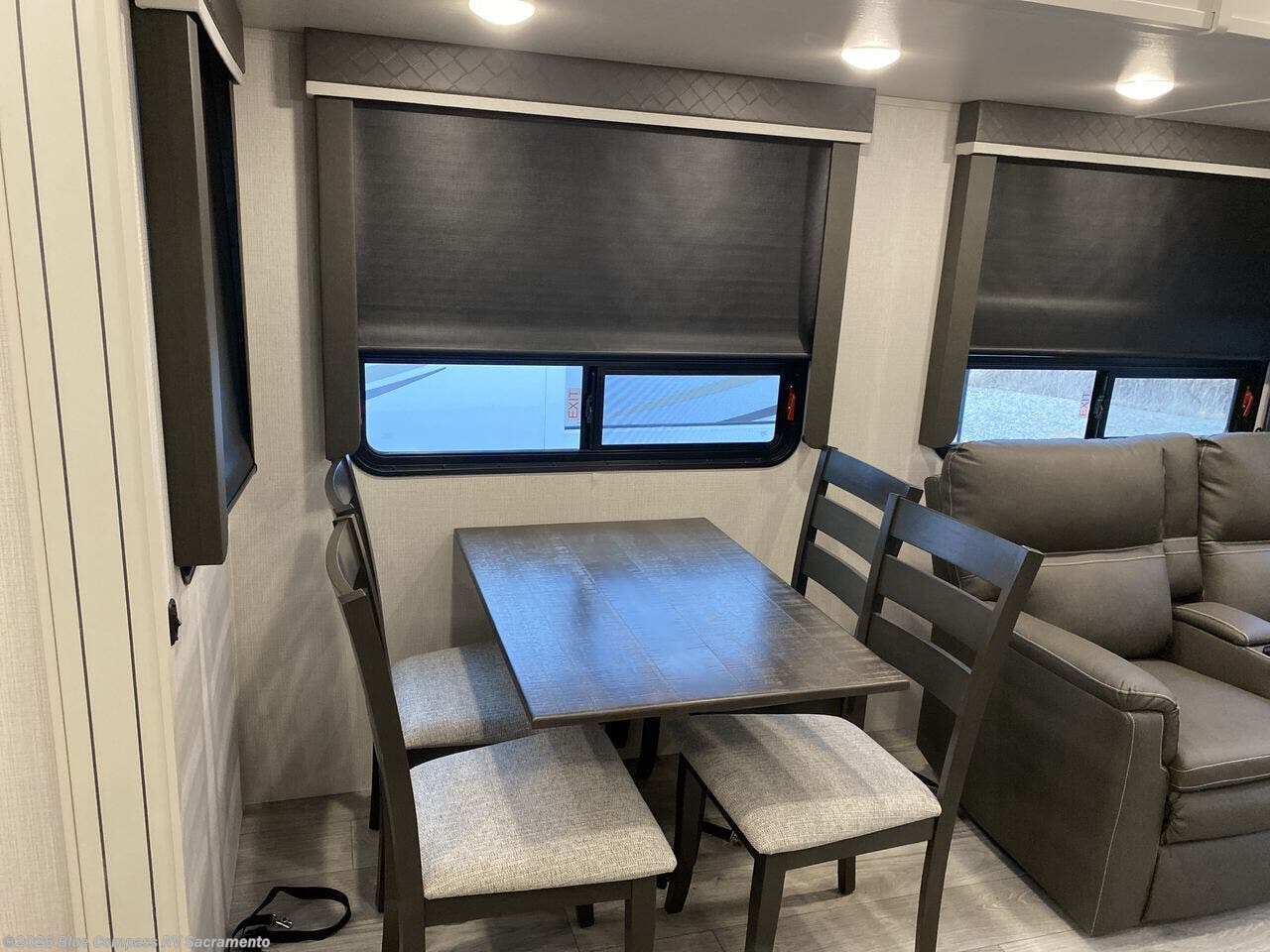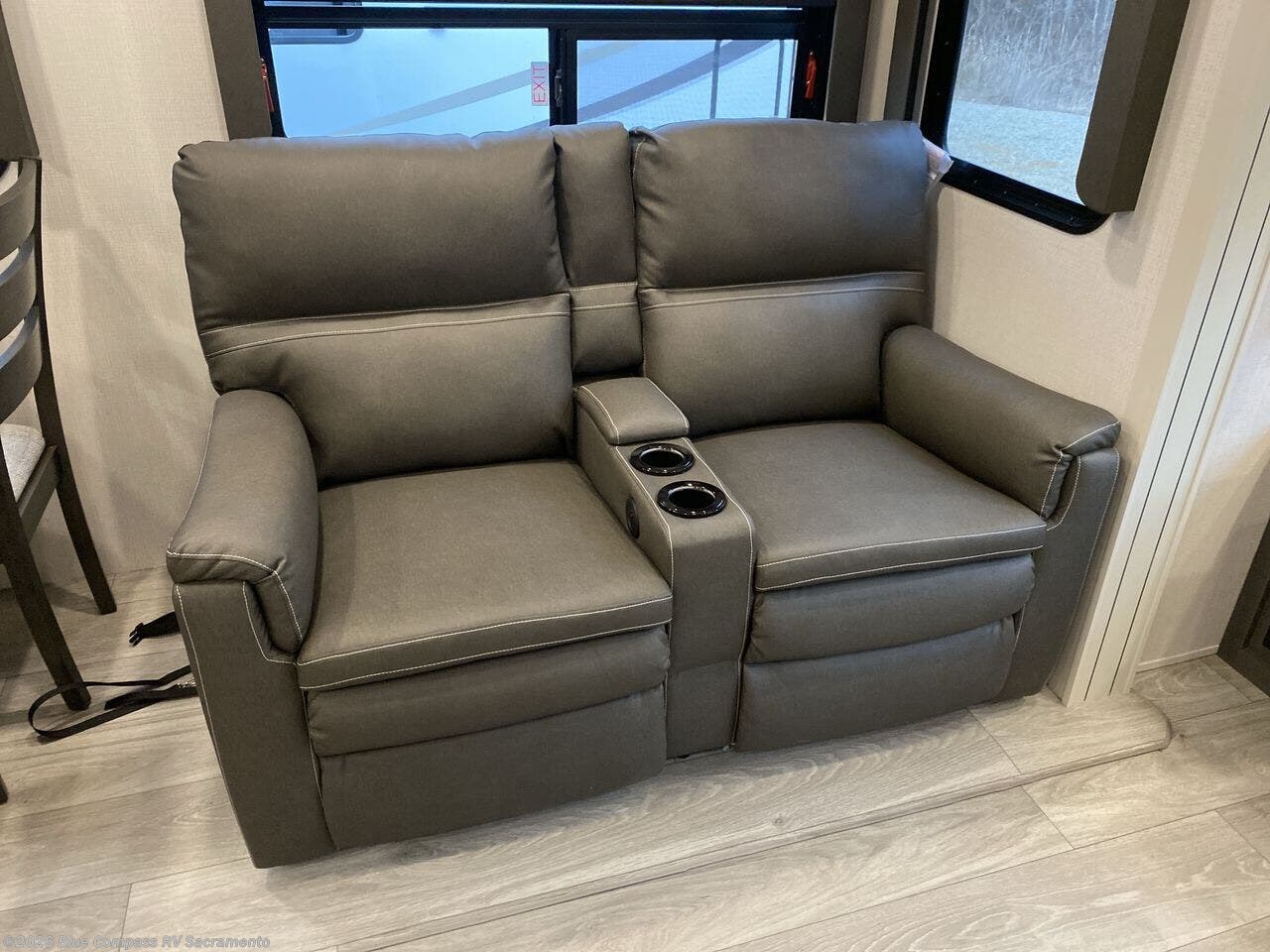 The dual opposing slides in the combined kitchen and living area will give you an open floorplan! You'll sleep on the queen-size bed in the front private bedroom, and there is under-bed storage, a full-height wardrobe, and a dresser with hidden storage for all of your personal belongings. As you spend time in the main living area, you'll appreciate having extra space thanks to the set of opposing slides, and the kitchen island will be easy to work around. You'll be able to relax on the tri-fold sleeper sofa and theater seating while you watch the LED HDTV with an pivoting entertainment door and hidden pantry. There is also a booth dinette with storage drawers, convenient shoe storage right as you enter the unit, and an exterior unobstructed pass-thru storage so nothing gets left behind.