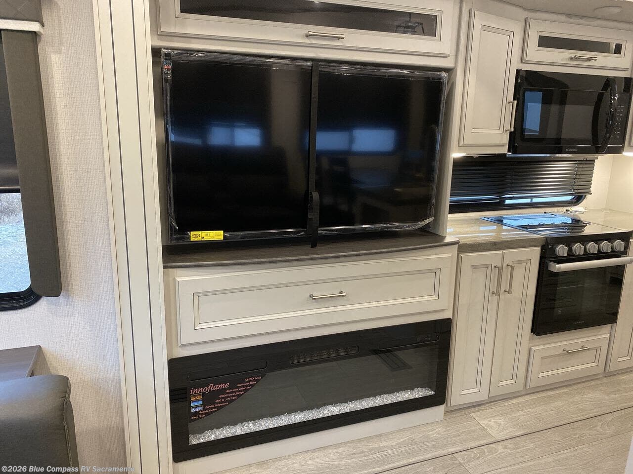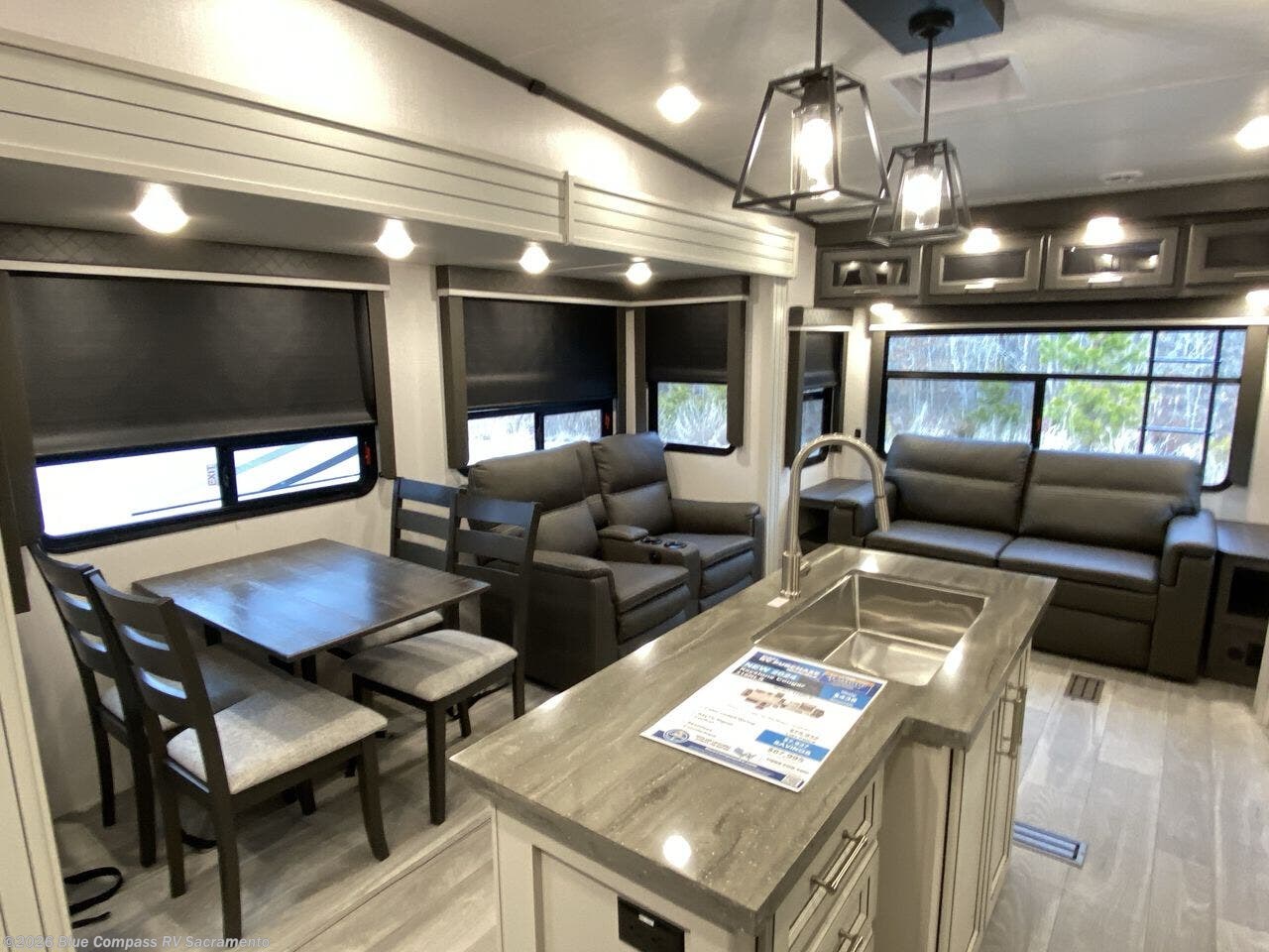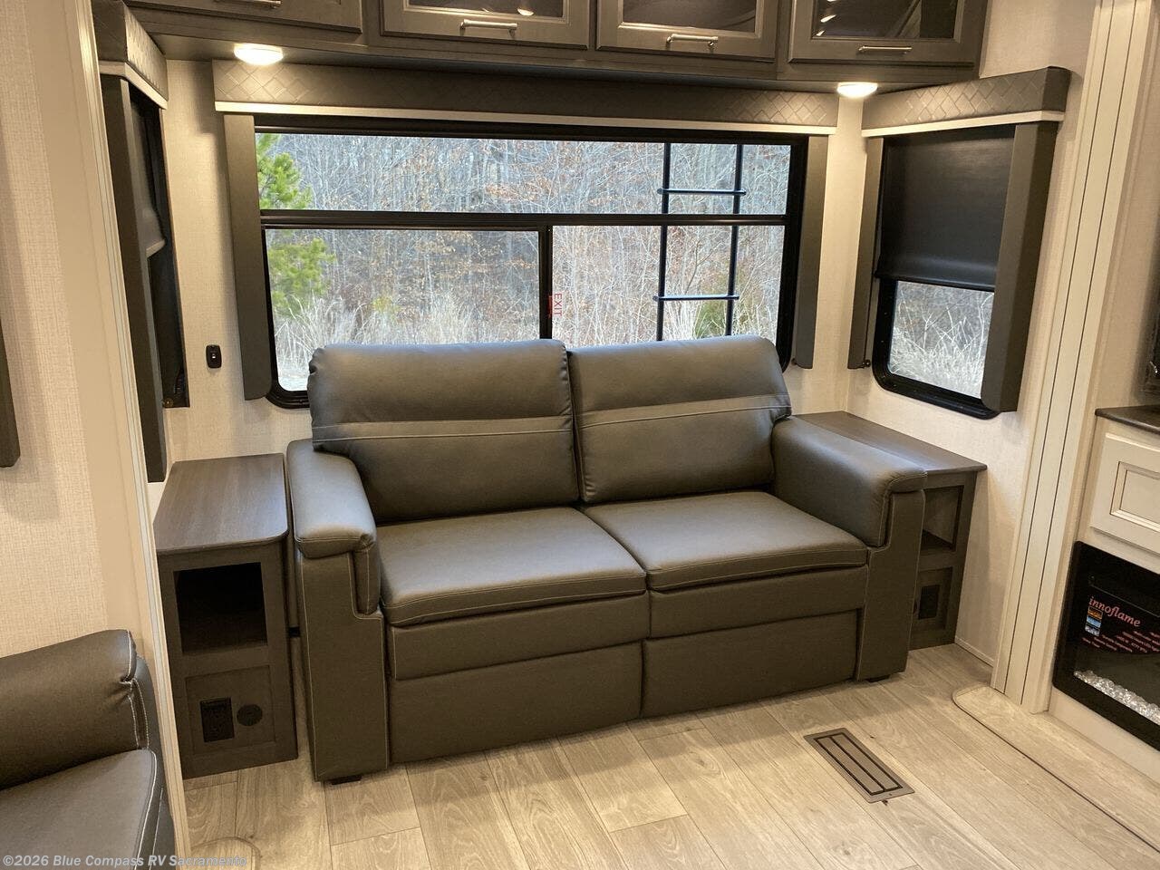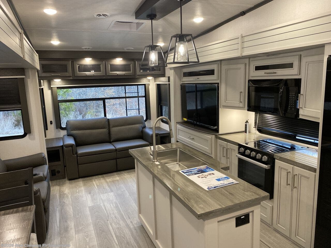 The dual opposing slides in the combined kitchen and living area will give you an open floorplan! You'll sleep on the queen-size bed in the front private bedroom, and there is under-bed storage, a full-height wardrobe, and a dresser with hidden storage for all of your personal belongings. As you spend time in the main living area, you'll appreciate having extra space thanks to the set of opposing slides, and the kitchen island will be easy to work around. You'll be able to relax on the tri-fold sleeper sofa and theater seating while you watch the LED HDTV with an pivoting entertainment door and hidden pantry. There is also a booth dinette with storage drawers, convenient shoe storage right as you enter the unit, and an exterior unobstructed pass-thru storage so nothing gets left behind.