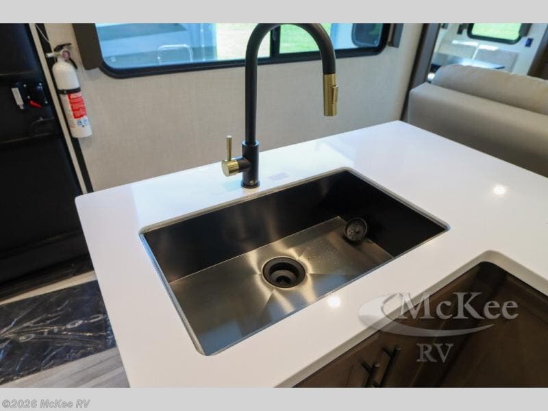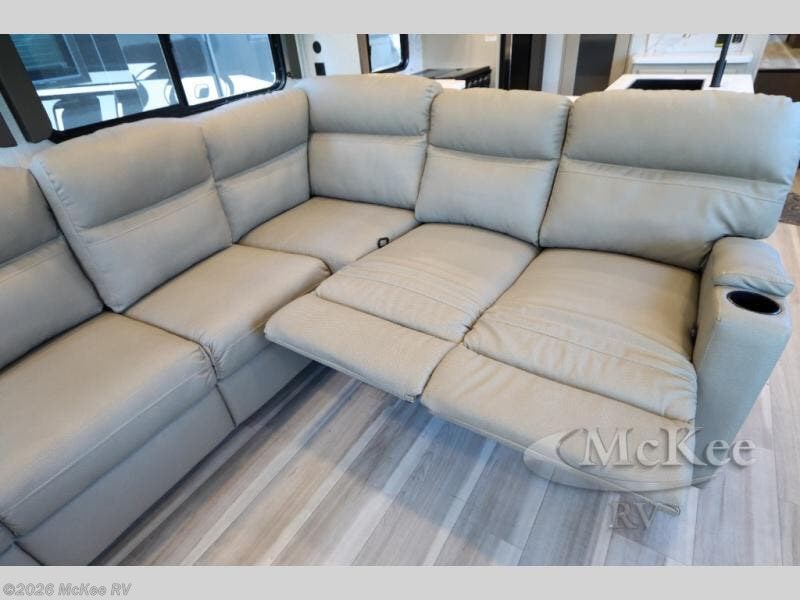 Time at the campground will be spent in comfort thanks to this fifth wheel that can sleep four to six people comfortably. The rear living area/den includes a huge L-shaped sofa with theater seats and a king tri-fold sofa, plus a free-standing dinette with an ottoman on one side, a fireplace, and an LED HDTV for movie nights. The chef of your group will love the additional counter space in the kitchen, along with a 21" Furrion range, plus a pantry and 16 cu. ft. 12V refrigerator. The full bath allows you to clean up each day and the front private bedroom will provide you with your own space at night. Here, you'll find a queen bed slide out that can optioned out for a king bed, plus a full height wardrobe, a second wardrobe with washer and dryer prep, and a dresser with a sliding top and hidden storage for valuables!