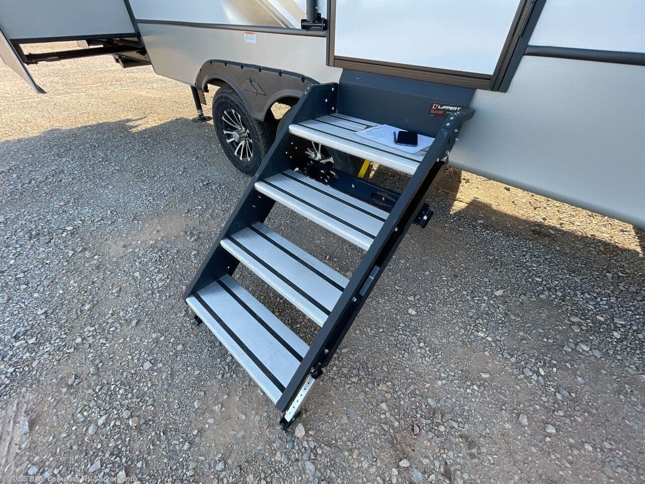 Time at the campground will be spent in comfort thanks to this fifth wheel that can sleep four to six people comfortably. The rear living area/den includes a huge L-shaped sofa with theater seats and a king tri-fold sofa, plus a free-standing dinette with an ottoman on one side, a fireplace, and an LED HDTV for movie nights. The chef of your group will love the additional counter space in the kitchen, along with a 21" Furrion range, plus a pantry and 16 cu. ft. 12V refrigerator. The full bath allows you to clean up each day and the front private bedroom will provide you with your own space at night. Here, you'll find a queen bed slide out that can optioned out for a king bed, plus a full height wardrobe, a second wardrobe with washer and dryer prep, and a dresser with a sliding top and hidden storage for valuables!