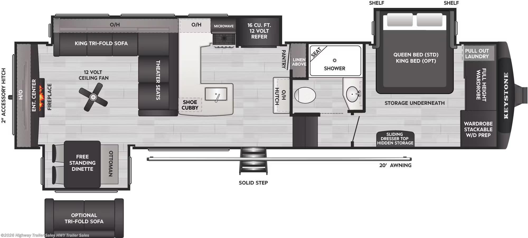 Enjoy your RV travels in style with this 2026 Keystone Cougar 320RDS. By owning this 2026 Keystone Cougar 320RDS, you’re joining the Keystone family! This rig sleeps 6, so it makes the perfect family RV. There’s plenty of room for the whole family thanks to three spacious slides. The fridge, stove make the perfect combo for eating well on the road. Even more RV memories will be made as you spend quality time hanging out on the theater seatingwatching a movie on the TV.. Memories are made around the dinner table, and this free standing dinette w/chairs is where you’ll make them. Traveling couples love this rig thanks to the king size bed. The heating option will keep your travels at the perfect temperature. Go longer without filling up thanks to the 75 gallon fresh water tanks. Outside, you’ll find black tank flush, detachable power cord, enclosed underbelly, hitch, ladder, power awning, power stabilizer jacks, screen door, skylight, slideout and tinted windows.