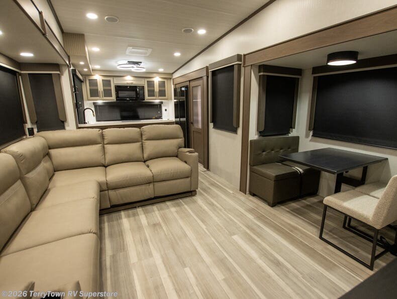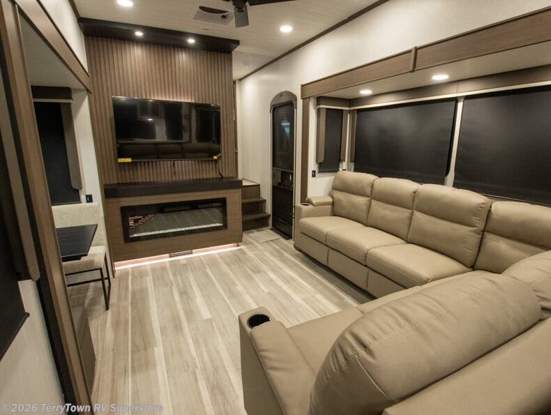Luxury is the name of the game with this spacious fifth wheel! The chef of your group will love the rear luxury kitchen with wrap-around counter space, a large sink, dishwasher prep, and all the appliances needed to cook and store meals. After dinner, your crew can relax in the middle living room on the L-shaped sofa or play a game at the dinette with bench seating on one side and chairs on the other. There is also a 12V ceiling fan here, along with a fireplace and a TV for movie nights! The spacious full bath includes a shower with a seat plus a large vanity counter to easily get ready each day, and you're going to love the front private bedroom with a queen bed slide out. There is also a full height wardrobe here, along with a pull-out laundry center, underbed storage, plus stackable washer and dryer prep!