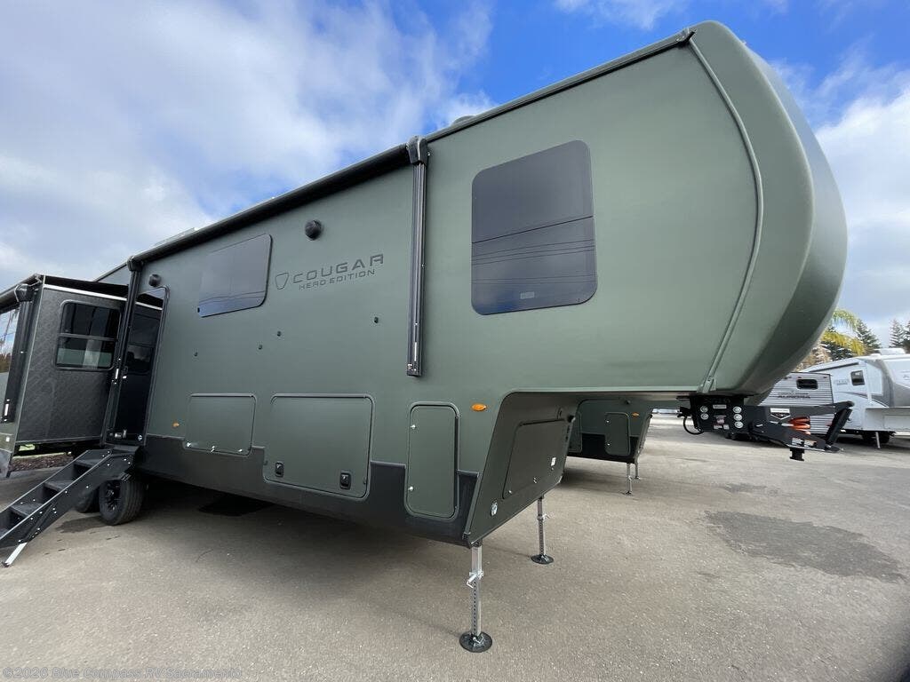 Spend more time having fun and less time worrying about your RV with the Keystone Cougar fifth wheel! These units have all that you will need for excellent vacations. The interior comes with 5/8" one-piece DynaSpan® flooring, tall slide outs for added comfort and head room, night roller shades throughout, and residential, shaker style hardwood cabinet doors and drawers. You will also enjoy decorative crown molding, a 5,500 BTU electric fireplace with thermostat control and remote, and a Max Air exhaust fan with rain sensor. The exterior is also fully outfitted with a convenience center, friction-hinge entry door, electric four-point auto leveling system, and slam-latch baggage doors. Each model is available with the optional Hero Edition. By choosing this edition, you can help support our nation's heros and their families by contributing to the Wounded Warrior Project. This optional package features an industry exclusive full-body paint matte finish, frameless windows, a glass entry door, blackout rims, and green LED exterior accent lighting; see dealer for more details!