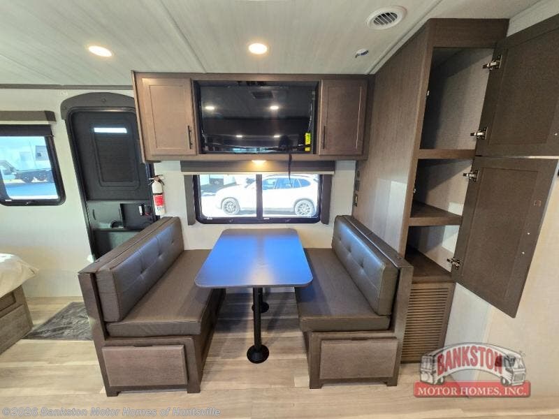 With a king-size bed, this Cougar Half-Ton travel trailer shows that you can still be comfortable even while you're away from home! The bed has drawers and nightstands on either side to keep your belongings tidy. There is a convenient shoe cubby right as you enter the unit to keep this space picked up as well. Right next to the booth dinette is the pantry, and next to the pantry is the full bathroom which is certainly one of the most valuable features to any trailer.
