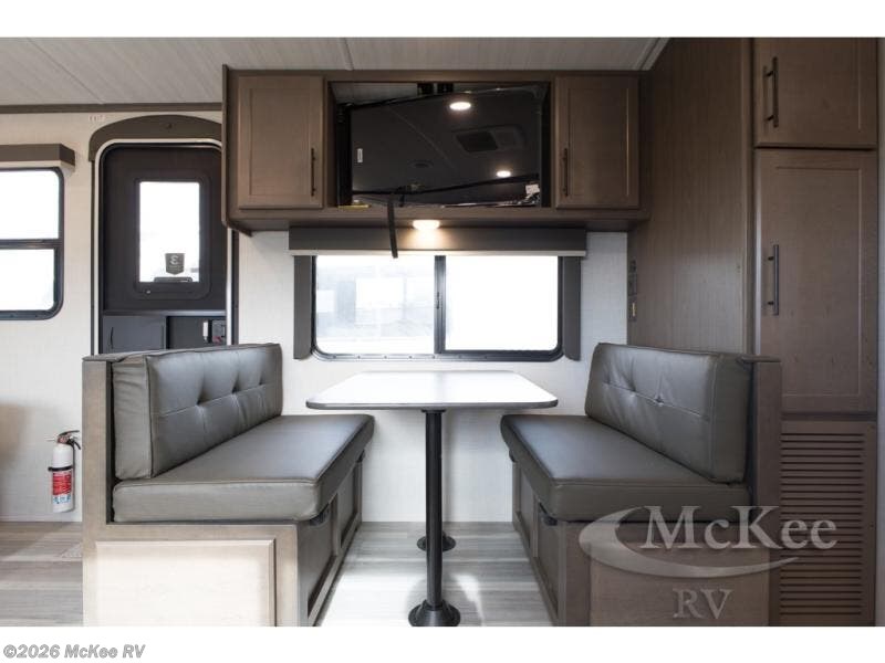 With a king-size bed, this Cougar Half-Ton travel trailer shows that you can still be comfortable even while you're away from home! The bed has drawers and nightstands on either side to keep your belongings tidy. There is a convenient shoe cubby right as you enter the unit to keep this space picked up as well. Right next to the booth dinette is the pantry, and next to the pantry is the full bathroom which is certainly one of the most valuable features to any trailer.