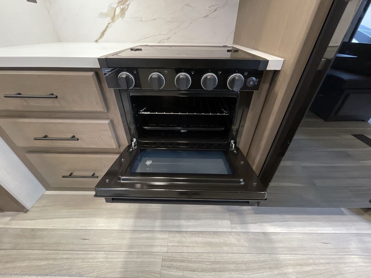 With a king-size bed, this Cougar Half-Ton travel trailer shows that you can still be comfortable even while you're away from home! The bed has drawers and nightstands on either side to keep your belongings tidy. There is a convenient shoe cubby right as you enter the unit to keep this space picked up as well. Right next to the booth dinette is the pantry, and next to the pantry is the full bathroom which is certainly one of the most valuable features to any trailer.