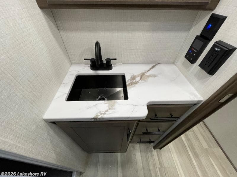You'll love camping in this rear kitchen fifth wheel that can sleep five to six! Up front, you will enjoy a private bedroom with a king bed and bedside wardrobe/nightstands as well as a wardrobe with washer and dryer prep. A complete bath provides a large shower, toilet and sink, plus linen storage which you are sure to appreciate as you travel. There are plenty of options for this unit making it easy to customize to your use and style. The theater seating and free standing dinette options can be selected in place of the sleeper sofa and booth dinette if you prefer. There is also a 16' awning to create even more living space to enjoy, and the unobstructed pass-through storage compartment can easily house all of your outdoor camping gear like lawn chairs and yard games.