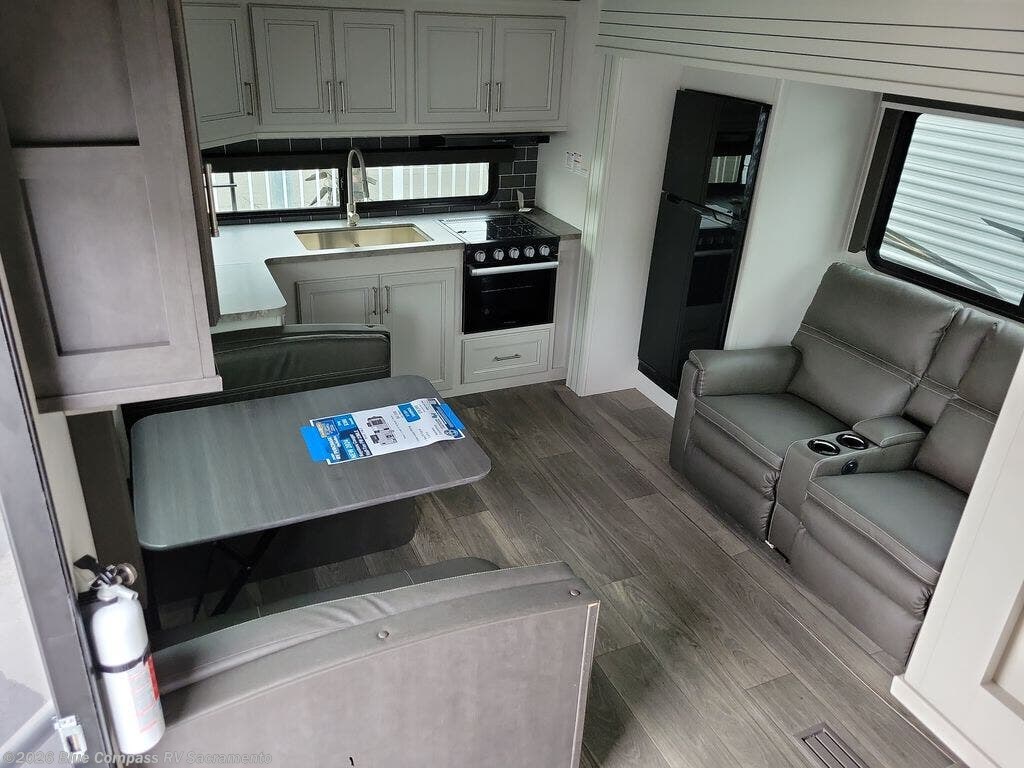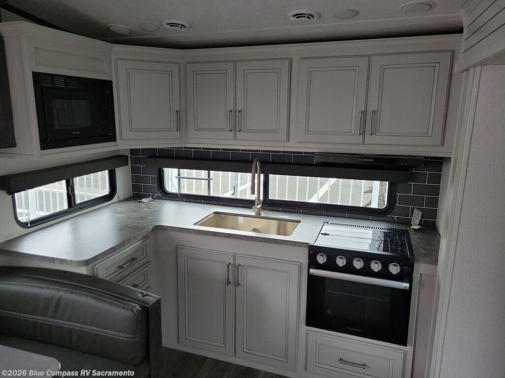 You'll love camping in this rear kitchen fifth wheel that can sleep five to six! Up front, you will enjoy a private bedroom with a king bed and bedside wardrobe/nightstands as well as a wardrobe with washer and dryer prep. A complete bath provides a large shower, toilet and sink, plus linen storage which you are sure to appreciate as you travel. There are plenty of options for this unit making it easy to customize to your use and style. The theater seating and free standing dinette options can be selected in place of the sleeper sofa and booth dinette if you prefer. There is also a 16' awning to create even more living space to enjoy, and the unobstructed pass-through storage compartment can easily house all of your outdoor camping gear like lawn chairs and yard games.