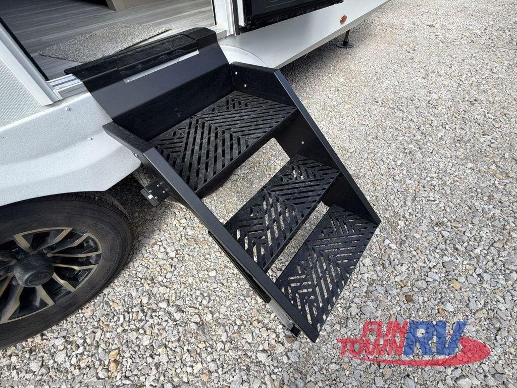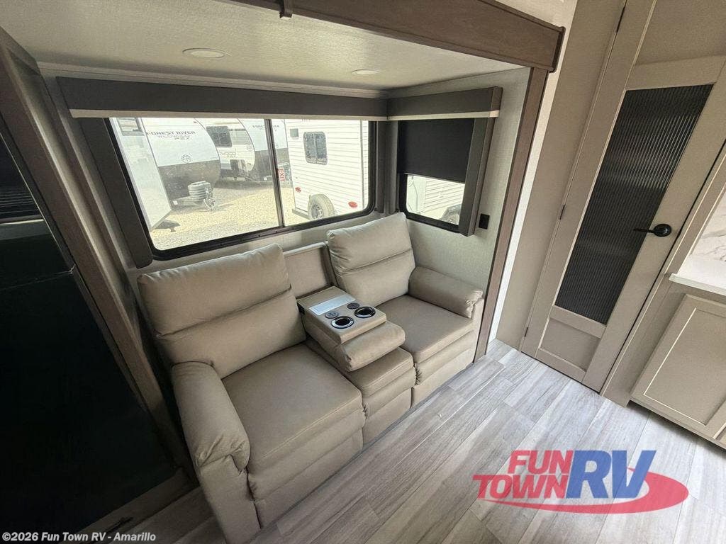 You'll love camping in this rear kitchen fifth wheel that can sleep five to six! Up front, you will enjoy a private bedroom with a king bed and bedside wardrobe/nightstands as well as a wardrobe with washer and dryer prep. A complete bath provides a large shower, toilet and sink, plus linen storage which you are sure to appreciate as you travel. There are plenty of options for this unit making it easy to customize to your use and style. The theater seating and free standing dinette options can be selected in place of the sleeper sofa and booth dinette if you prefer. There is also a 16' awning to create even more living space to enjoy, and the unobstructed pass-through storage compartment can easily house all of your outdoor camping gear like lawn chairs and yard games.