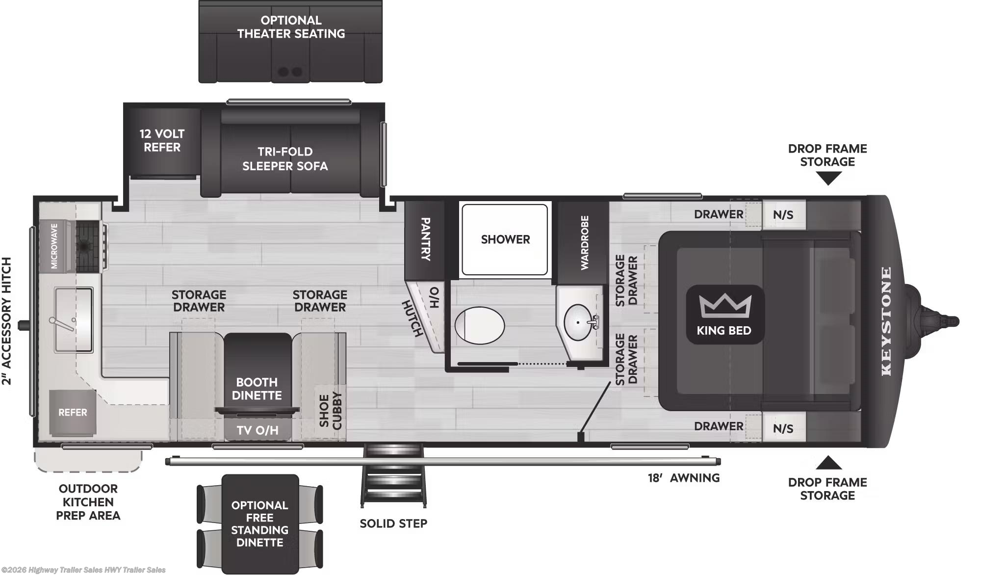 Your camping memories will be unforgettable in this 2026 Keystone Cougar Half-Ton 25MLWE. Be a part of the Keystone family with this 2026 Keystone Cougar Half-Ton 25MLWE. If you’re looking for a family RV, you’ve found it: this rig sleeps 6. The one slide allows for easy setup and just enough extra space inside. Entertain or cook up a cozy meal just for you in this RV kitchen equipped with the fridge, oven, stove. Kick back and relax in the living area with the TV. Memories are made around the dinner table, and this dinette bed is where you’ll make them. The king size bed makes it a perfect camper for couples. You’ll never get too hot or too cold inside your rig thanks to the heating option. If you’re thinking of heading off grid, this rig has a 54 fresh water tank. While the inside of this rig is enough on its own, the outside also features black tank flush, enclosed underbelly, exterior speakers, external shower, fiberglass sidewalls, heated underbelly, hitch, ladder, outside kitchen, pass thru storage, power awning, power roof vent, roof vent, screen door, skylight, slam latch baggage doors, slideout, spare tire kit, stabilizer jacks and tinted windows. An outside shower makes it easier to keep your adventure rig clean. The outside kitchen allows you to enjoy the Great Outdoors at meal time. Store all the gear you need for your travels with the spacious pass-through storage underneath.