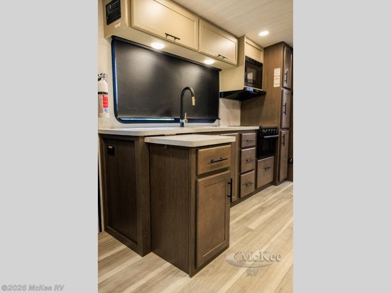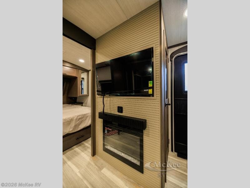 Wherever you decide to camp in this travel trailer, you'll be met with comfort and convenience! The full rear bath includes a space saving sliding door, toilet, sink, and linen closet for towels. A large slide out provides more space to move about, and here you'll enjoy the tri-fold sleeper sofa and booth dinette with storage drawers. There is also a fireplace and TV across from the furniture to enjoy movie nights! The chef of your group can make meals on the cooktop or in the microwave, and there is a pull-out countertop for extra counter space. Up front, a private bedroom includes a king bed, dual nightstands, and washer and dryer prep.