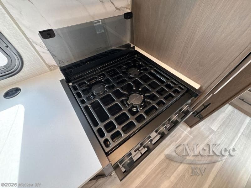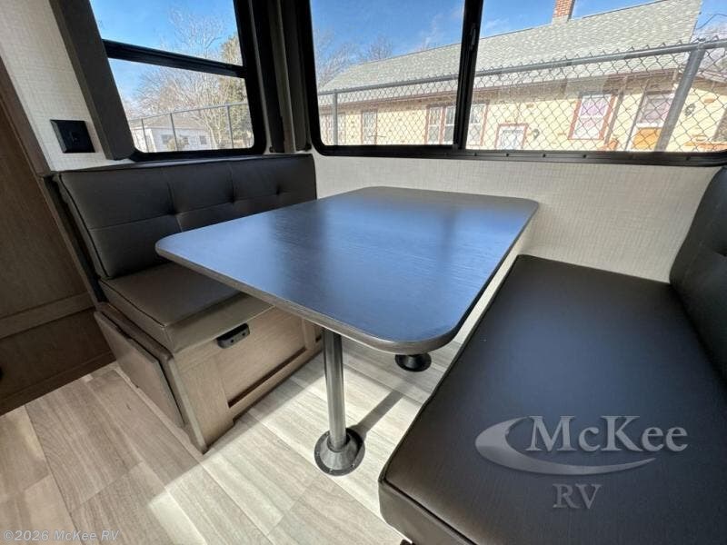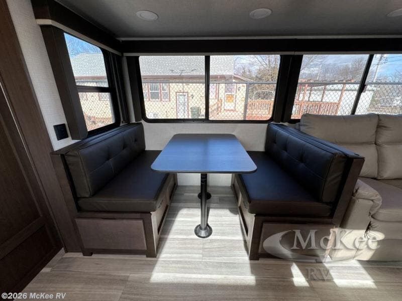 Wherever you decide to camp in this travel trailer, you'll be met with comfort and convenience! The full rear bath includes a space saving sliding door, toilet, sink, and linen closet for towels. A large slide out provides more space to move about, and here you'll enjoy the tri-fold sleeper sofa and booth dinette with storage drawers. There is also a fireplace and TV across from the furniture to enjoy movie nights! The chef of your group can make meals on the cooktop or in the microwave, and there is a pull-out countertop for extra counter space. Up front, a private bedroom includes a king bed, dual nightstands, and washer and dryer prep.