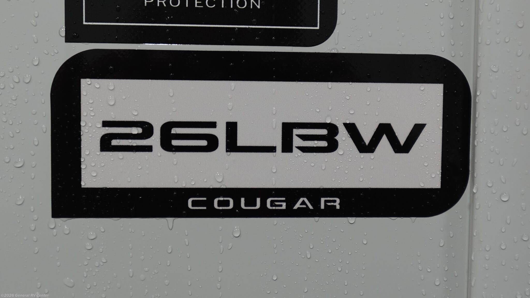 Keystone Cougar Half-Ton travel trailer 26LBW highlights: Large Slide Out King Bed 2" Accessory Hitch Kitchen Pantry Wherever you decide to camp in this travel trailer, you'll be met with comfort and convenience! The full rear bath includes a space saving sliding door, toilet, sink, and linen closet for towels. A large slide out provides more space to move about, and here you'll enjoy the tri-fold sleeper sofa and booth dinette with storage drawers. There is also a fireplace and TV across from the furniture to enjoy movie nights! The chef of your group can make meals on the cooktop or in the microwave, and there is a pull-out countertop for extra counter space. Up front, a private bedroom includes a king bed, dual nightstands, and washer and dryer prep. The Keystone Cougar Half-Ton fifth wheel and travel trailers are known as one of America's favorites for a reason! Some of those reasons are the exclusive features that come from Keystone, like the Winegard Air 360+ omni-directional rooftop antenna, the in-floor heating ducts, and the HyperCore composite wall construction with Vixen Fibrogloss high-gloss finish. The Cougar Half-Ton has a Climate Guard protection package with heat-deflecting white sidewalls, two roof attic vents, PEX plumbing and more to enjoy four season camping. Inside, you'll love the dimmable lighting, night roller shades throughout, shower skylight, and bedside USB outlets to keep your electronics charged.